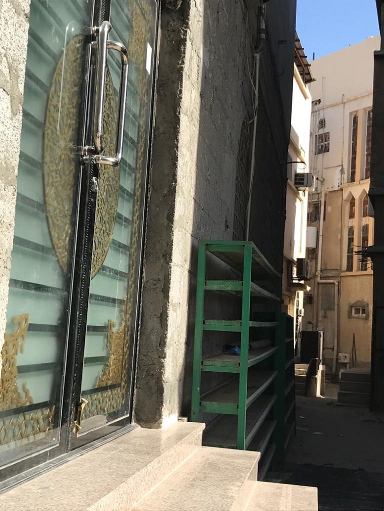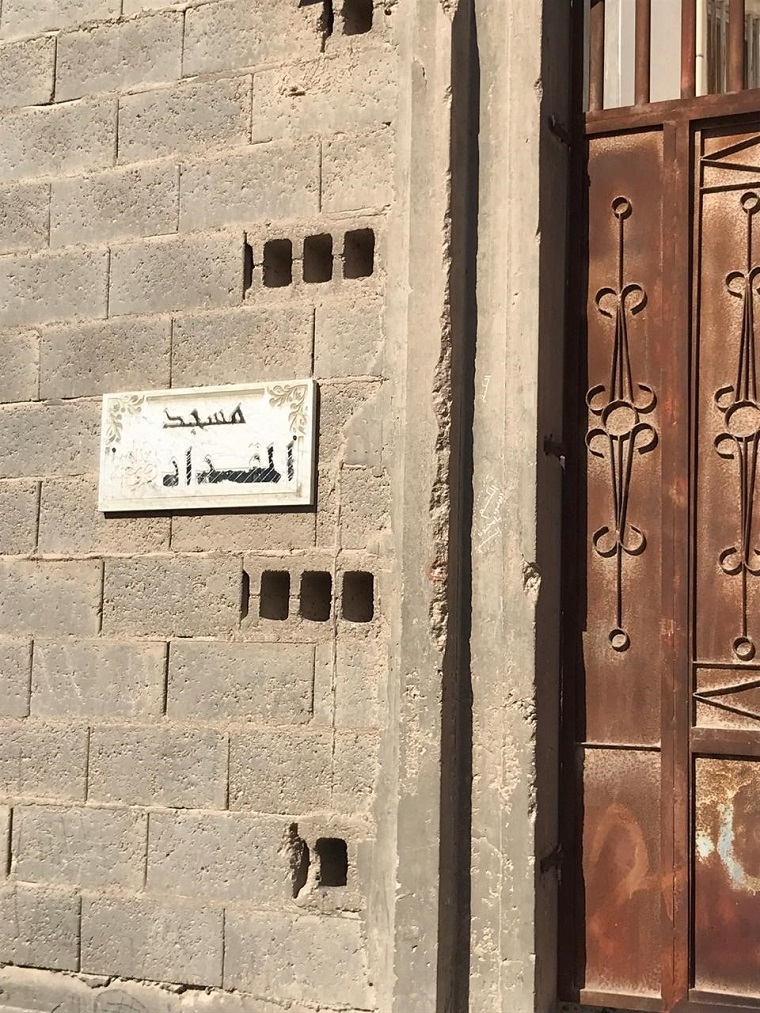 بوابة المسجد بعد الترميم الأخير قبل اكتمال بناءه، وبجواره موضع البيت الذي كان ينزل فيه الشيخ عبد المحسن اللويمي