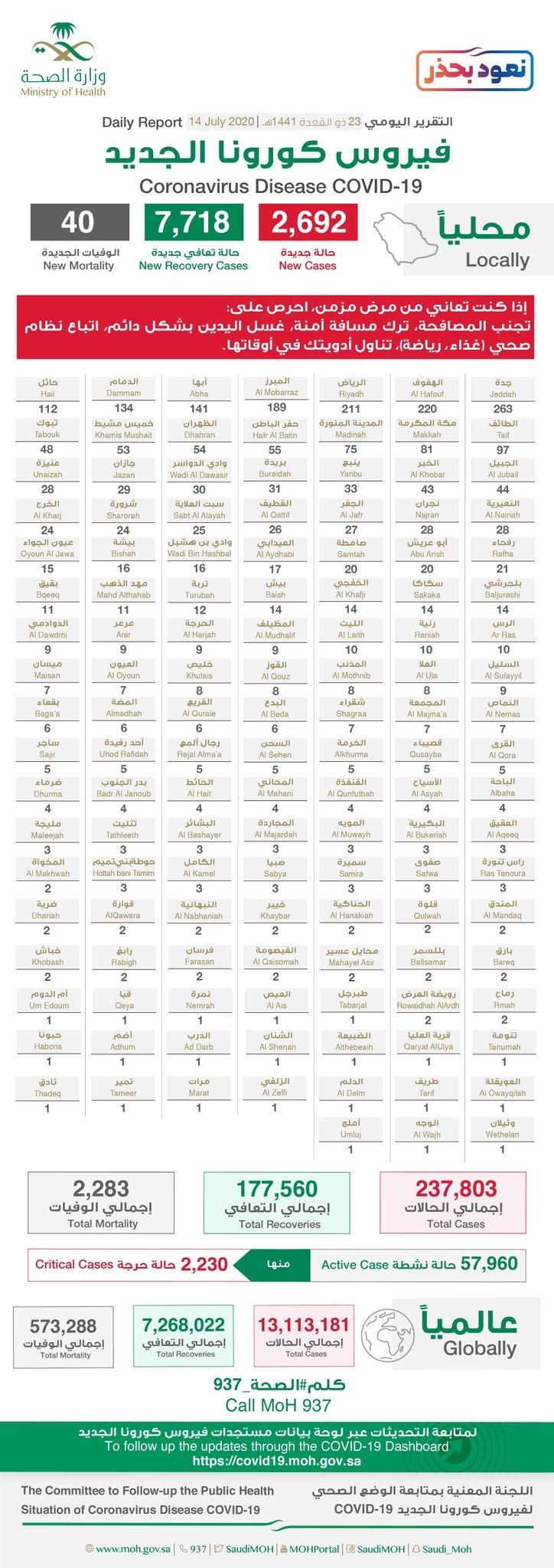 وتم تسجيل 7718 حالات تعافٍ جديدة منها 522 في القطيف 134 بصفوى، لترتفع الحالات الإجمالية للتعافي إلى 177560 حالة (75 % من إجمالي الإصابات المسجلة).