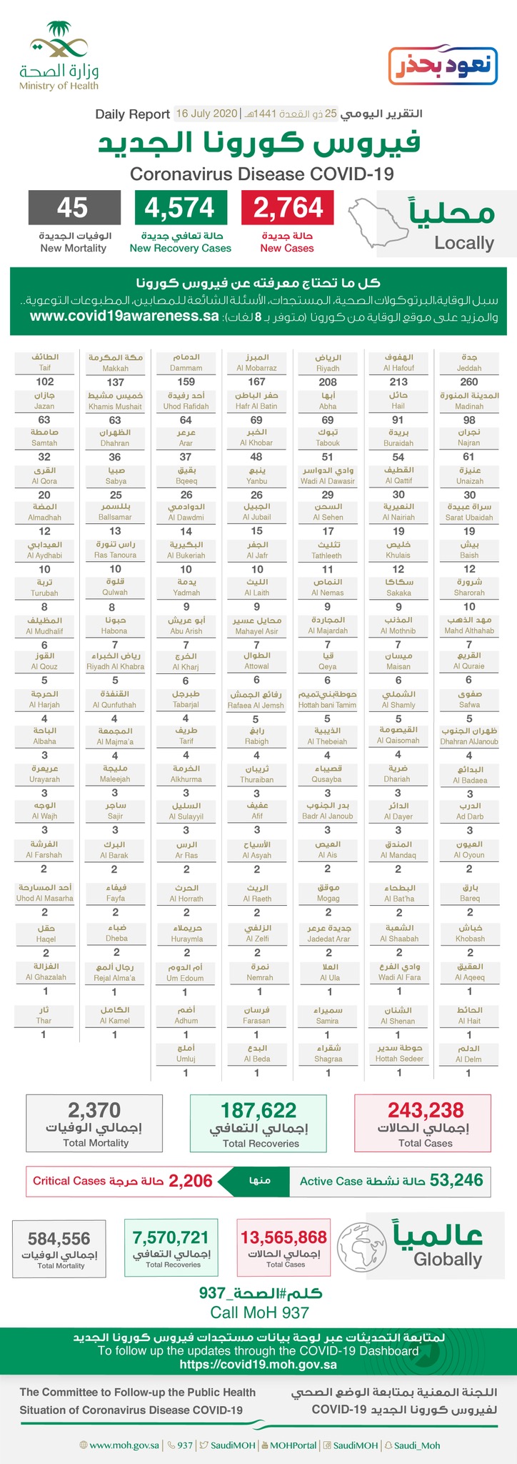 وتم تسجيل 4,574 حالات تعافٍ جديدة منها 439 في القطيف و65 بصفوى و3 بسيهات، لترتفع الحالات الإجمالية للتعافي إلى 187,622 حالة ”76 % من إجمالي الإصابات المسجلة“.
