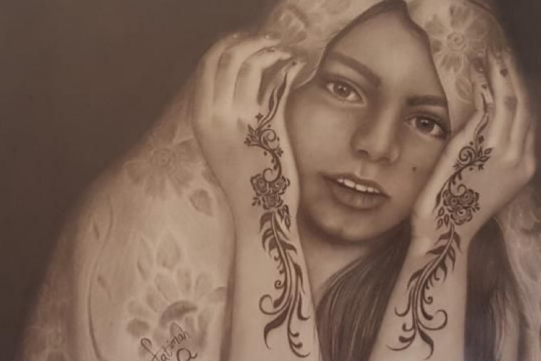 قالت فاطمة عبد الحي المضري إبنة ال 22 ربيعًا بأنها قاربت على الإنتهاء من لوحة رسمت فيها جدها المرحوم ”الملا حسن الباقر“، مستخدمة فيها الفحم وأقلام الرصاص.