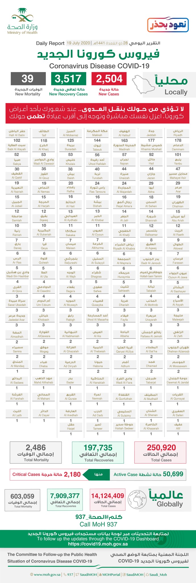 أعلنت وزارة الصحة، اليوم الاحد، تسجيل 2504 إصابة جديدة بفيروس ”كورونا“ المستجد ”كوفيد - 19“ في المملكة. منها 19 في القطيف و4 في صفوى. ليرتفع إجمالي الإصابات في المملكة إلى 250920 حالة مؤكدة.