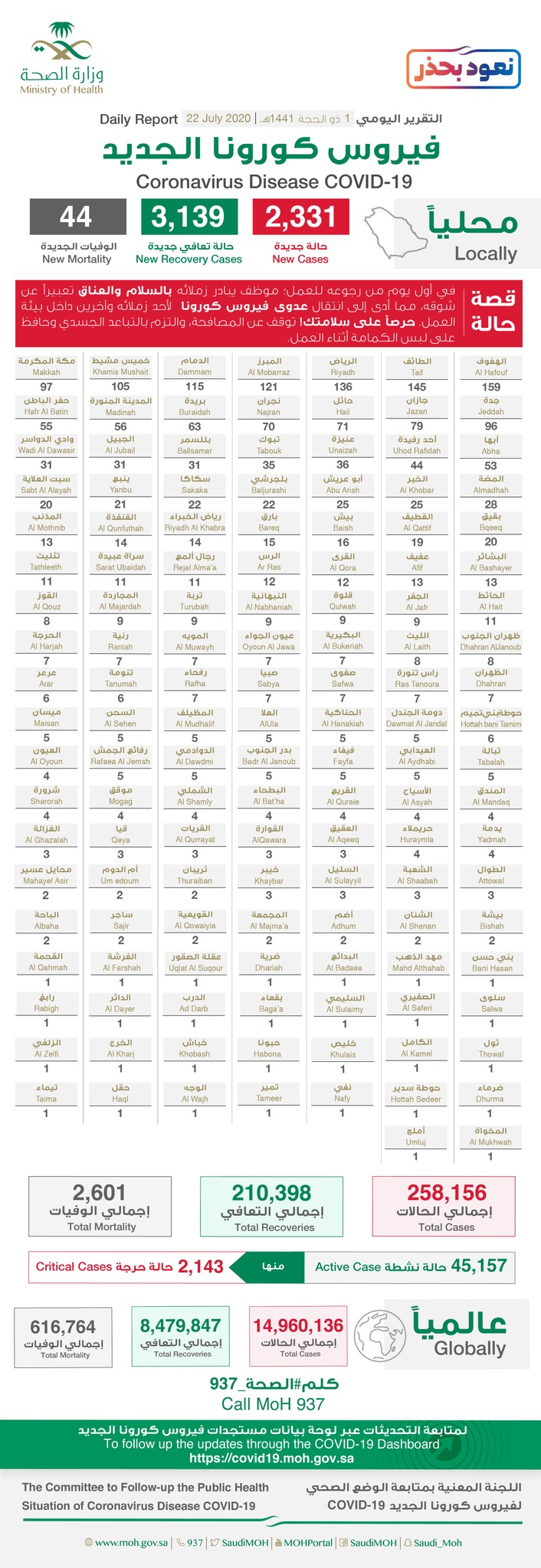 وأعلنت الوزارة تسجيل 44 حالة وفاة جديدة منها 3 حالات وفاة في القطيف، ليصل عدد الوفيات الكلي إلى 2,601 حالة وفاة.