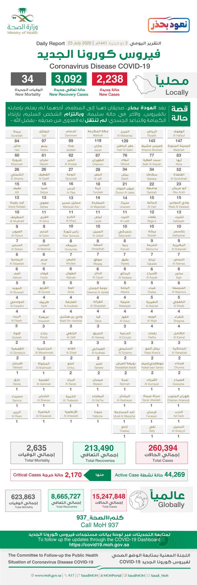 فيما تم تسجيل 3092 حالة تعافٍ إضافية منها 123 في القطيف و21 بصفوى، و34 حالة وفاة جديدة في المملكة وحالة واحدة بالقطيف.