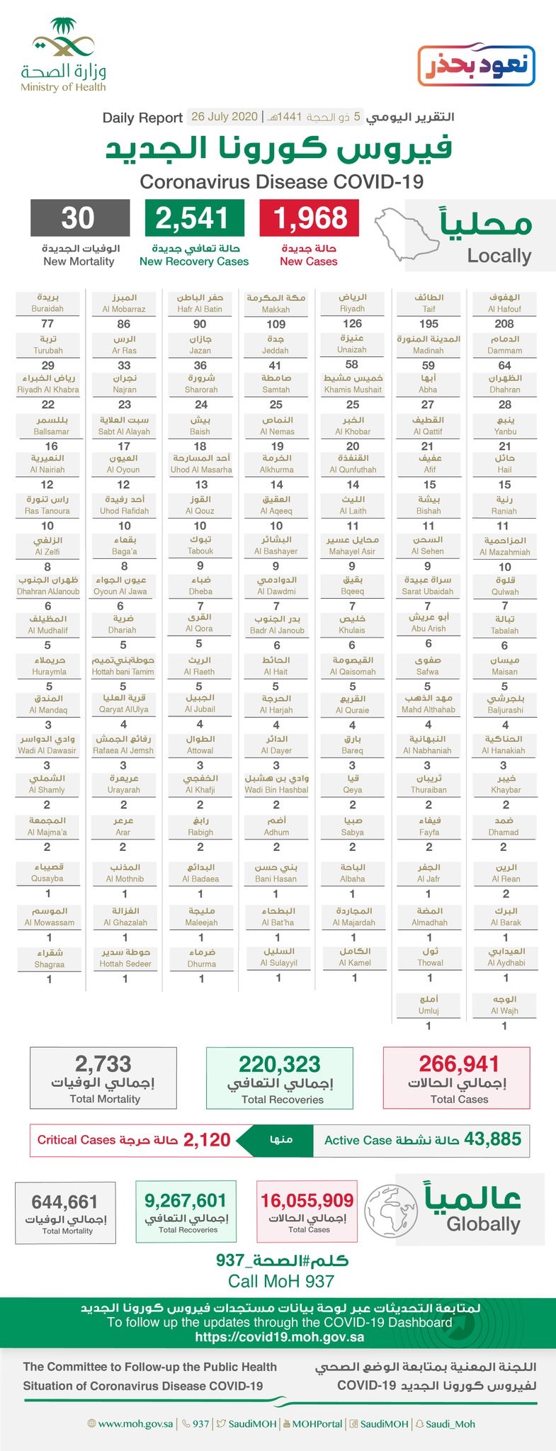 وتم تسجيل 2,541 حالة تعافٍ جديدة منها 57 في القطيف و11 بصفوى، لترتفع الحالات الإجمالية للتعافي إلى 220,323 حالة ”82 % من إجمالي الإصابات المسجلة“.