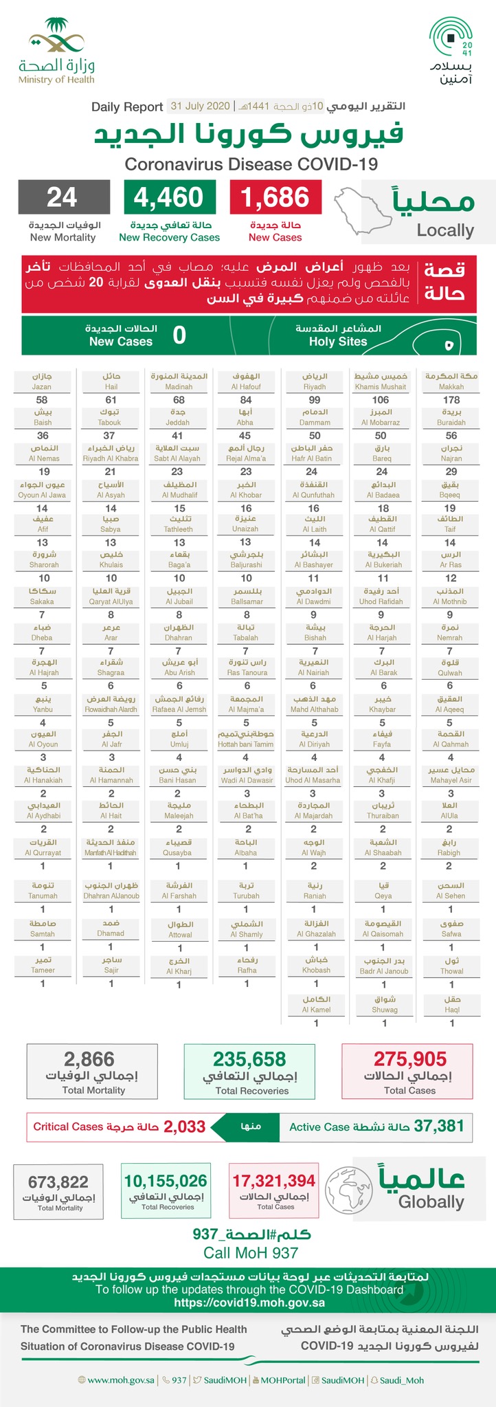 أعلنت وزارة الصحة اليوم ”الجمعة“ تسجيل 1686 إصابة جديدة بفايروس كورونا المستجد المسبب لمرض ”كوفيد19“. منها 14 في القطيف و1 بصفوى.