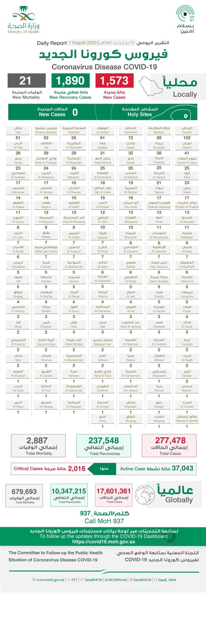 الصحة: تسجيل 1573 إصابة جديدة بكورونا.. منها 12 في القطيف و6 بصفوى