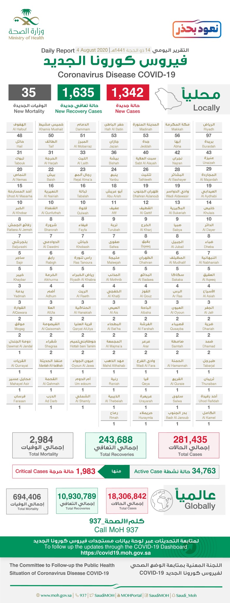 وبينت ان عدد الحالات المؤكدة في المملكة ”281,435“ حالة، من بينها ”34,763“ حالة نشطة لاتزال تتلقى الرعاية الطبية، ومعظمهم حالتهم الصحية مطمئنة، منها ”1,983“ حالة حرجة.