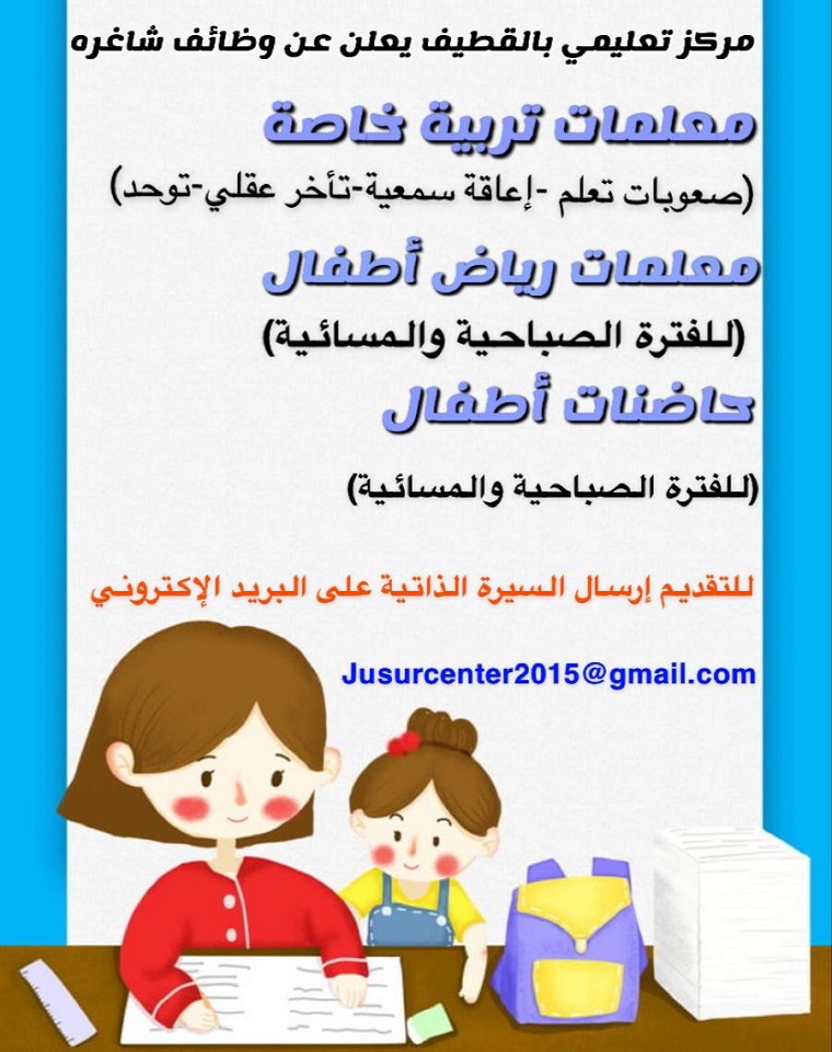 يعلن مركز تعليمي بالقطيف عن وظائف شاغرة لِـ: