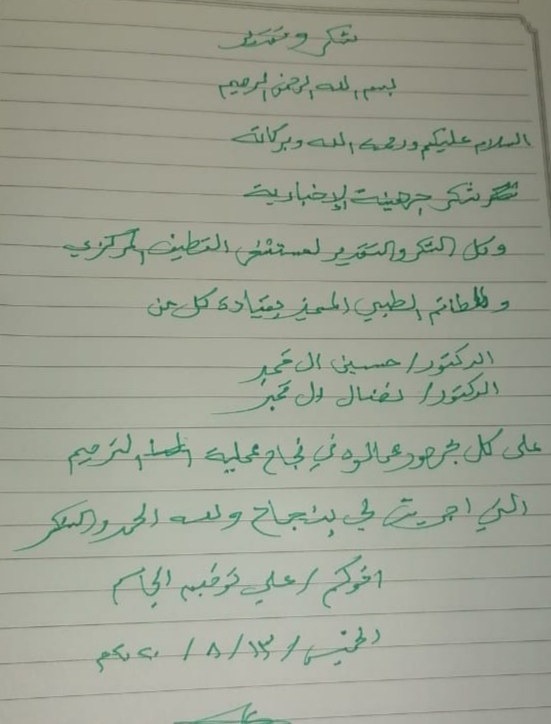 وأشار إلى تشخيص الدكتور المؤمن في عدم الحاجة لبتر أصبعه وإنما القيام بعملية ترميم حيث تفاهم مع الدكتور نضال بشأن ذلك