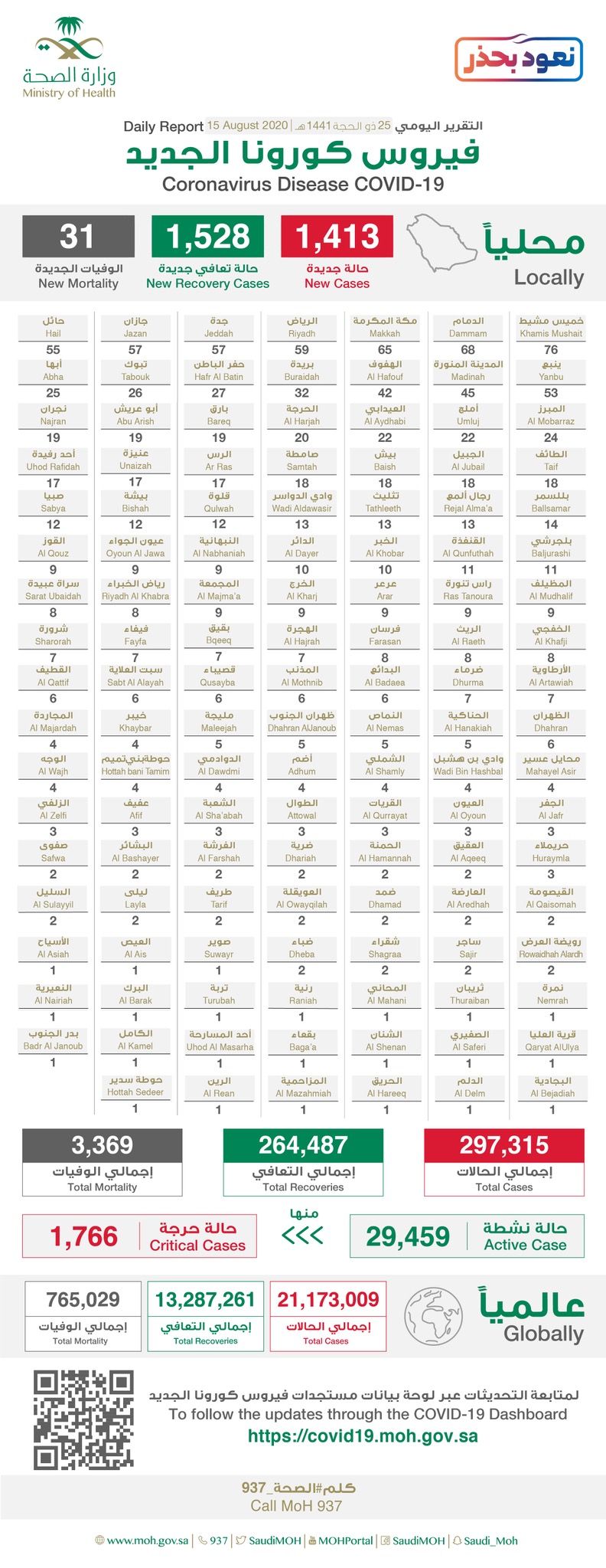 ولمعرفة تفاصيل إجمالي توزيع حالات الإصابة والتعافي، يمكن زيارة الموقع الإلكتروني المخصص من وزارة الصحة للاطلاع على مستجدات الفايروس في المملكة، والإحصاءات اليومية عبر الرابط https: //covid19. moh. gov. sa/