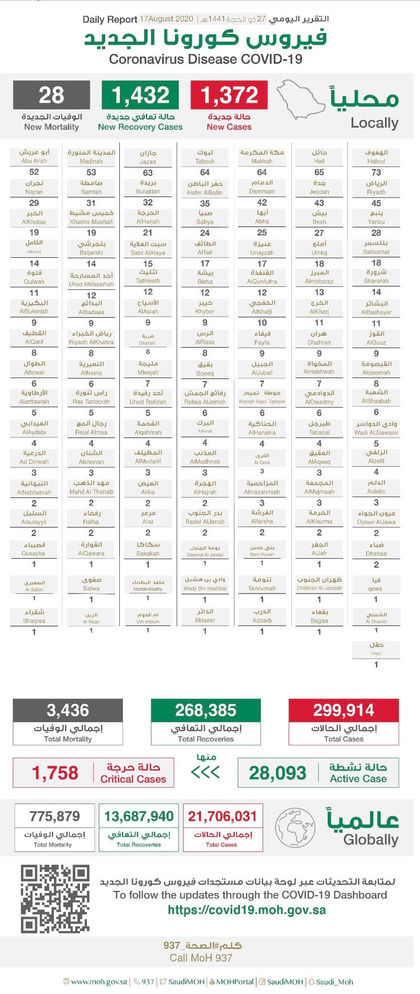 وتم تسجيل 1,432 حالة تعافٍ جديدة منها 6 في القطيف، لترتفع الحالات الإجمالية للتعافي إلى 268,385 حالة ”89% من إجمالي الإصابات المسجلة“.