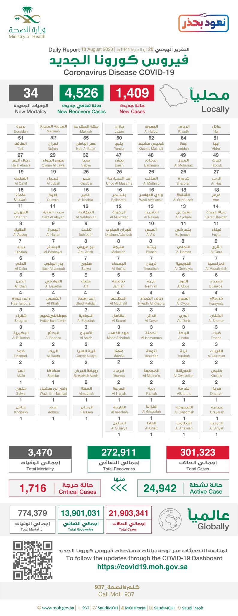 وبينت ان عدد الحالات المؤكدة في المملكة ”301323“ حالة، من بينها ”24940“ حالة نشطة لاتزال تتلقى الرعاية الطبية، ومعظمهم حالتهم الصحية مطمئنة، منها ”1,716“ حالة حرجة.