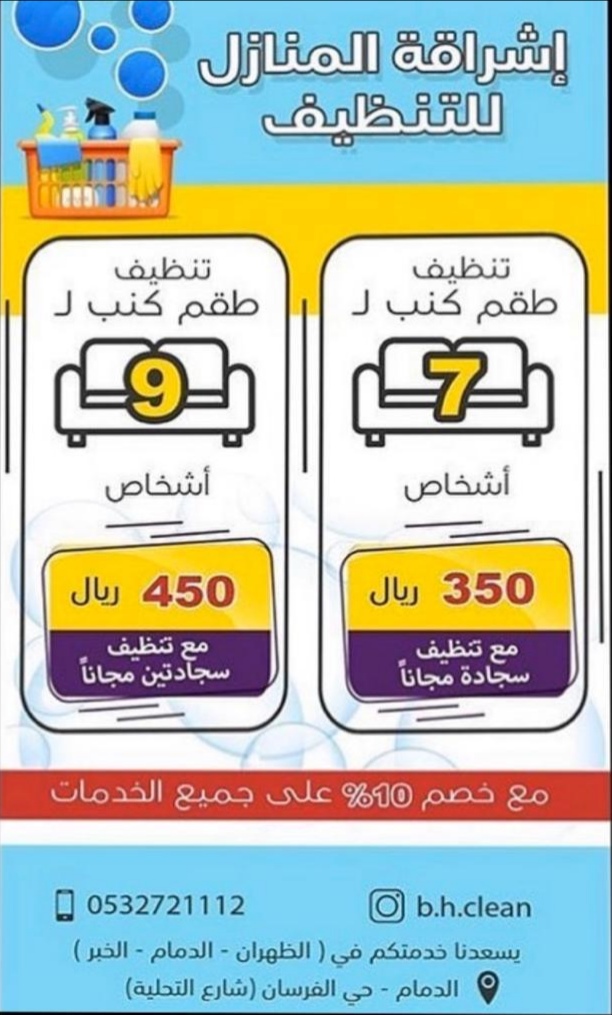 • تنظيف كنب ”9 أشخاص“ = 450 ريال مع تنظيف 2موكيت مجاناً