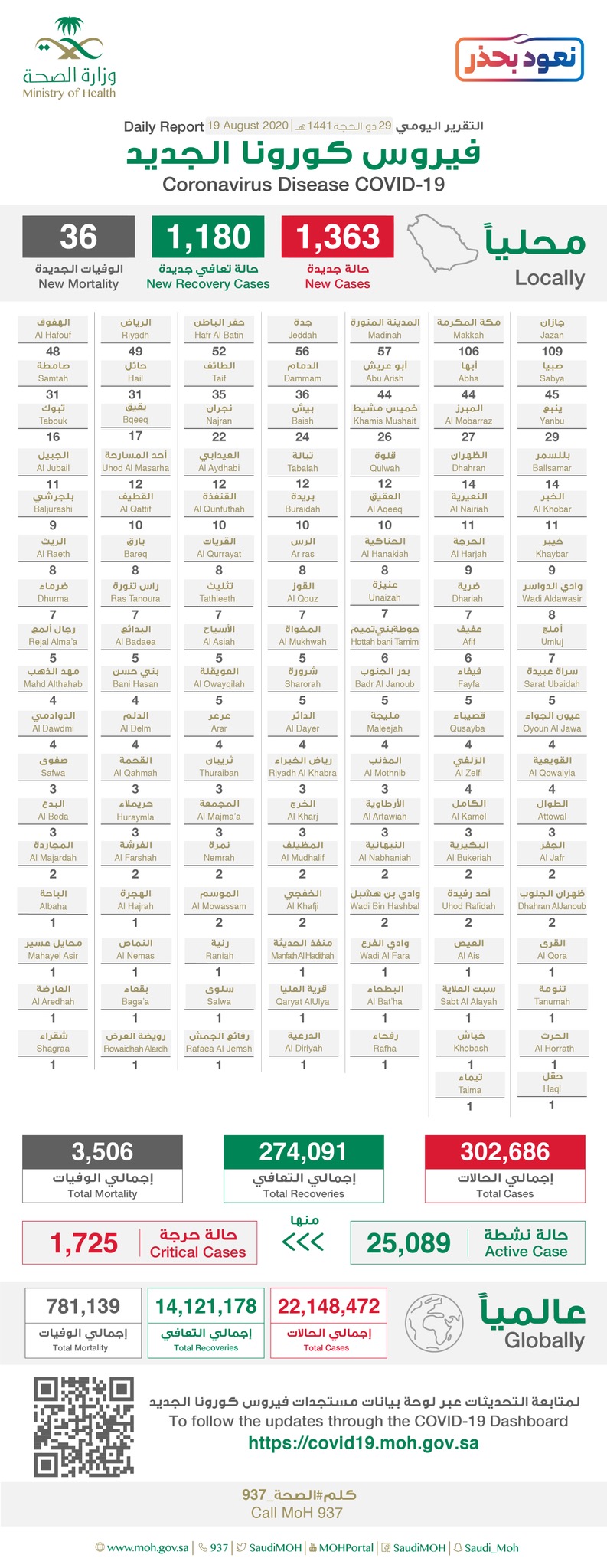 وبينت ان عدد الحالات المؤكدة في المملكة ”302686“ حالة، من بينها ”25089“ حالة نشطة لاتزال تتلقى الرعاية الطبية، ومعظمهم حالتهم الصحية مطمئنة، منها ”1725“ حالة حرجة.