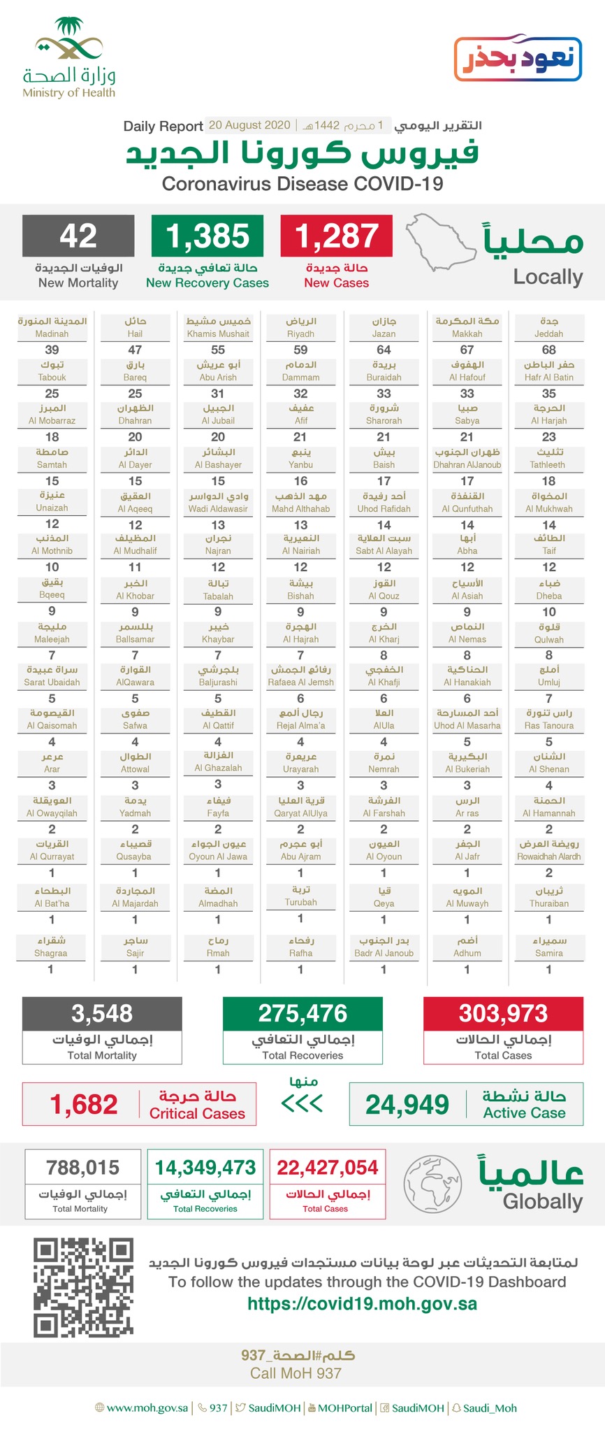 ليصبح عدد الحالات المؤكدة في المملكة «303973» حالة، من بينها «24949» حالة نشطة لاتزال تتلقى الرعاية الطبية، ومعظمهم حالتهم الصحية مطمئنة، منها «1682» حالة حرجة.