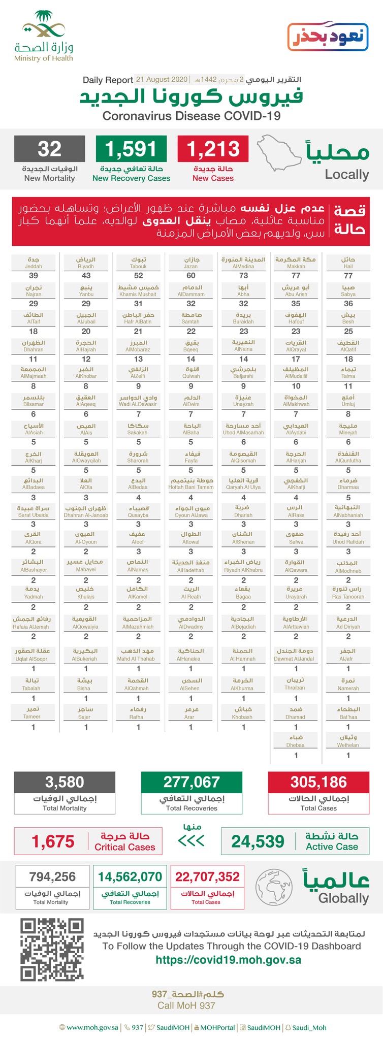وأصبح عدد الحالات المؤكدة في المملكة «305186» حالة، من بينها «24539» حالة نشطة لاتزال تتلقى الرعاية الطبية، ومعظمهم حالتهم الصحية مطمئنة، منها «1675» حالة حرجة.