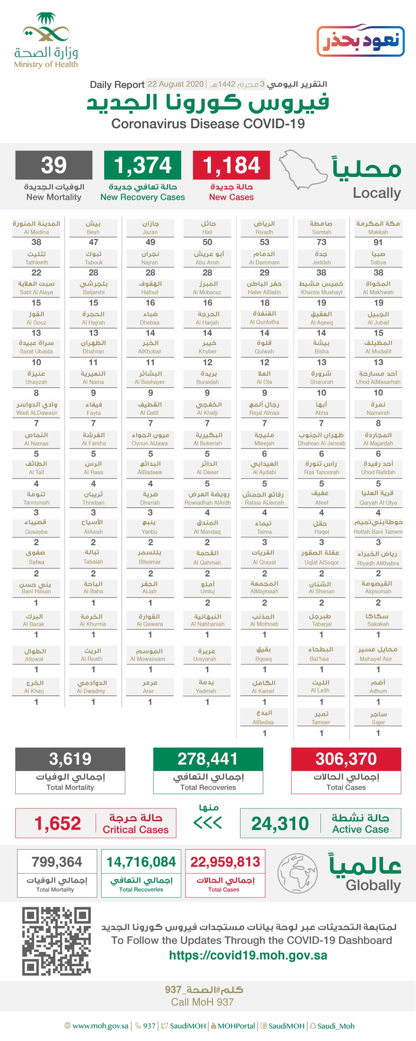 وأصبح عدد الحالات المؤكدة في المملكة «306370» حالة، من بينها «24310» حالات نشطة لاتزال تتلقى الرعاية الطبية، ومعظمهم حالتهم الصحية مطمئنة، منها «1652» حالة حرجة.