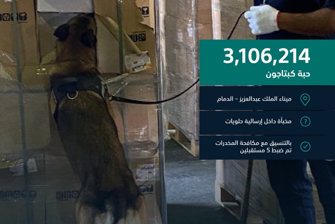 أعلنت الجمارك السعودية إحباط تهريب أكثر من 3 ملايين حبة كبتاجون مخدرة داخل شحنة حلويات.