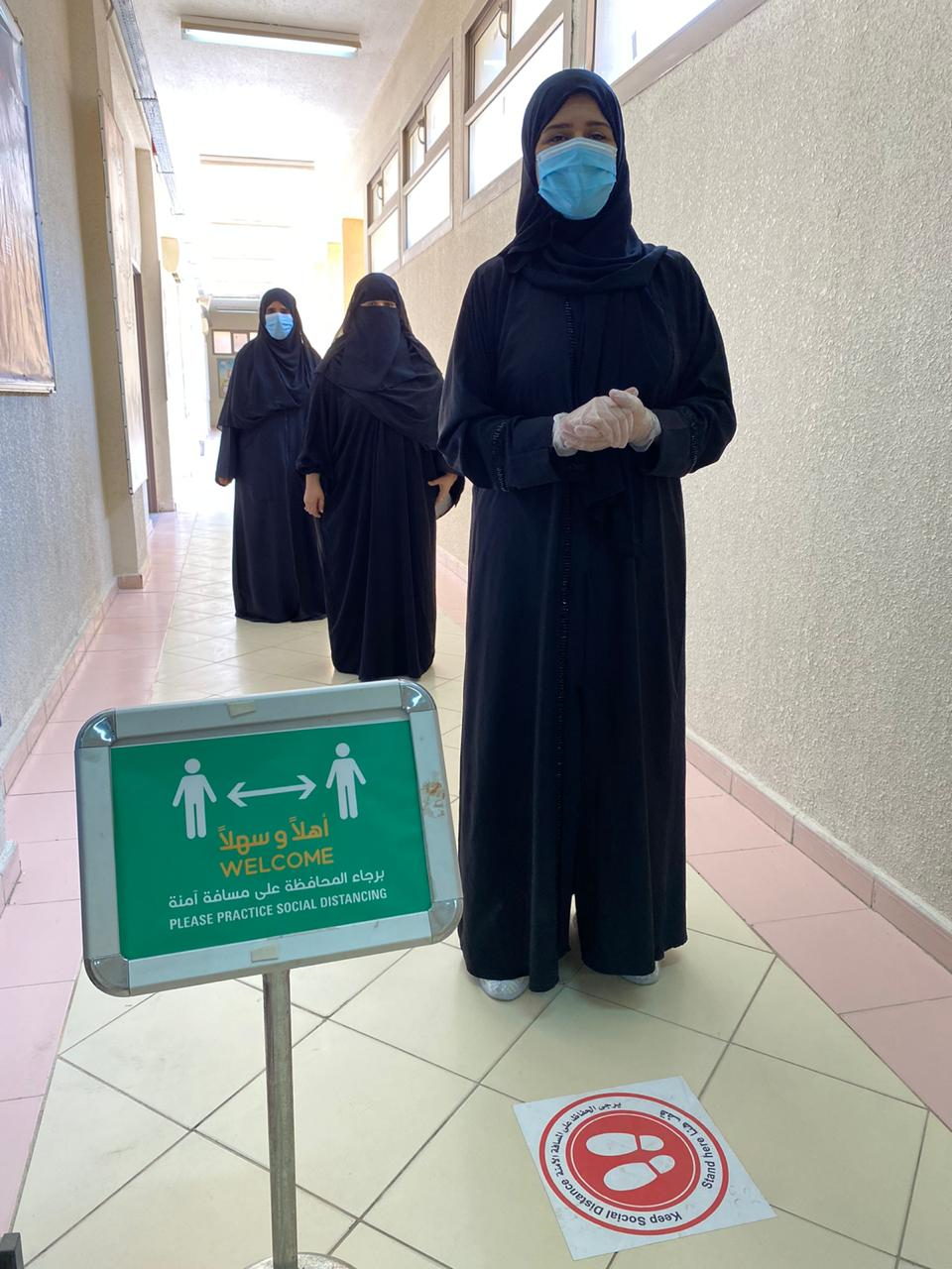 وأضاف وضعت كل مدرسة ملصقات أرضية تحدد مسارات كل ولي امر او طالب مع وضع حواجز لتنظيم طابور الانتظار بما يضمن التباعد بين كل شخصين بما لايقل عن مترين كما يلزم منسوبو المدارس والطلاب وأولياء الأمور بارتداء الكمامة طوال الوقت