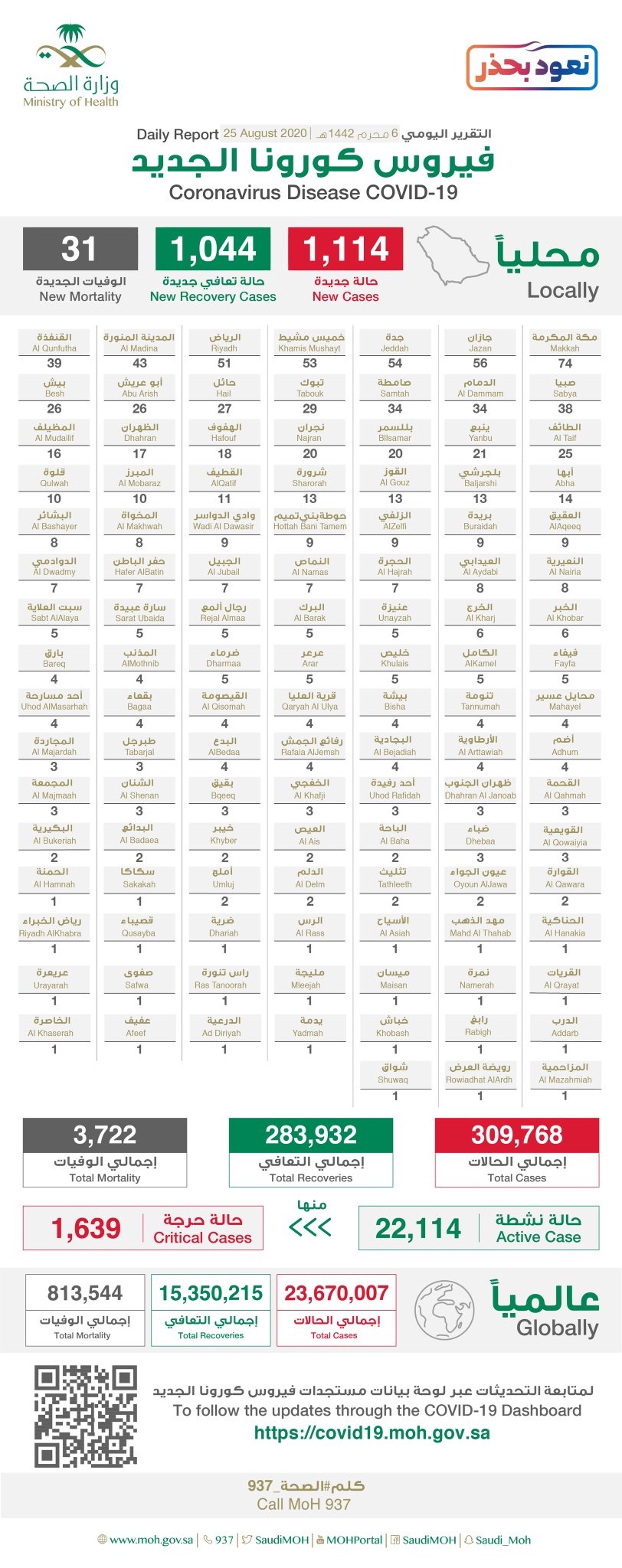 أعلنت وزارة الصحة اليوم ”الثلاثاء“ تسجيل 1114 إصابة جديدة بفايروس كورونا المستجد المسبب لمرض ”كوفيد19“. منها 11 في القطيف و1 بصفوى.