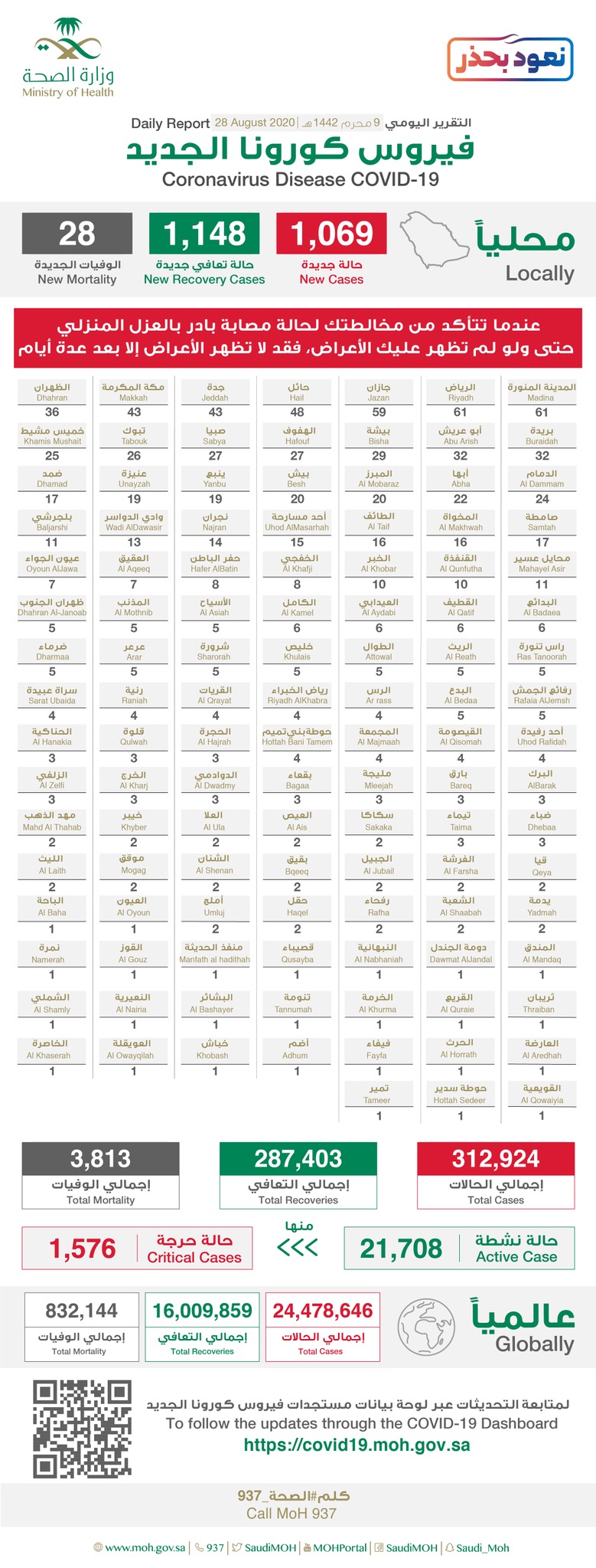 فيما بلغ عدد الوفيات ”3813“ حالة، بإضافة ”28“ حالة وفاة جديدة منها حالة واحدة بالقطيف ”يرحمهم الله جميعاً“.