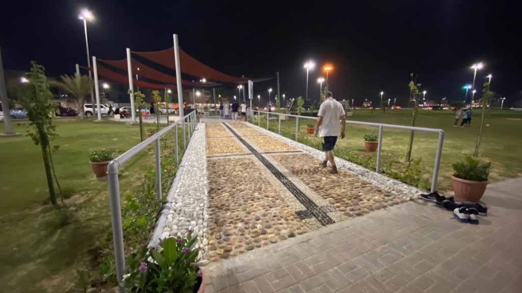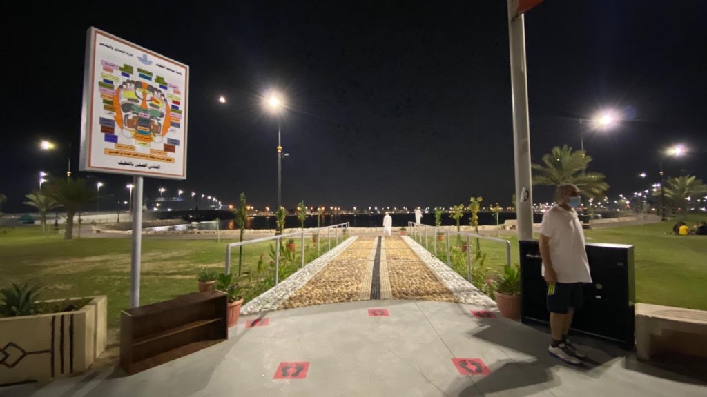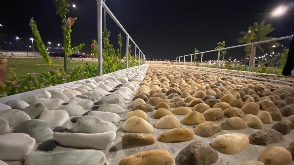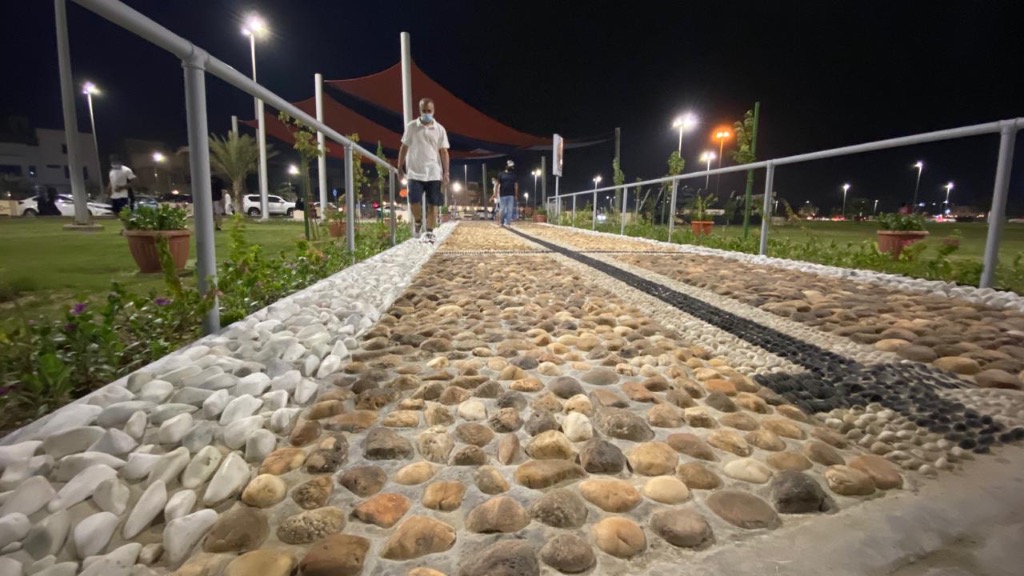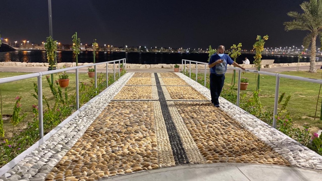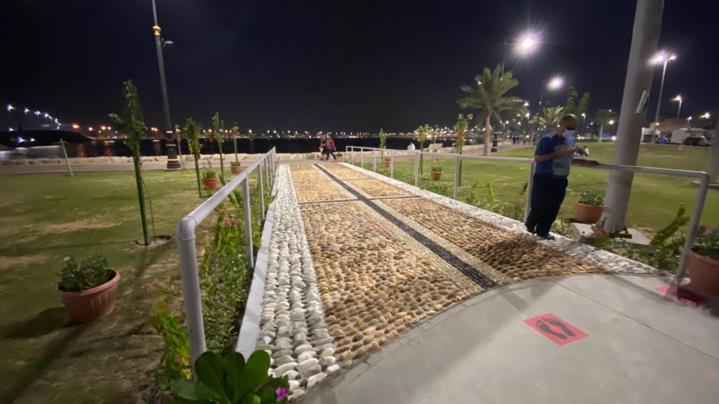 واستخدمت في تشييد الممر مادة الحجر المرمر والرخام بأحجام مختلفة للمشي عليها، في سبيل إزالة الطاقة السلبية وتنقية الهالة الجسدية. وجاء ذلك تبعا لتوجيهات أمين المنطقة الشرقية المهندس فهد الجبير، في وقت سابق، خاصة في الواجهات البحرية والكورنيشات، وكذلك الحدائق العامة.