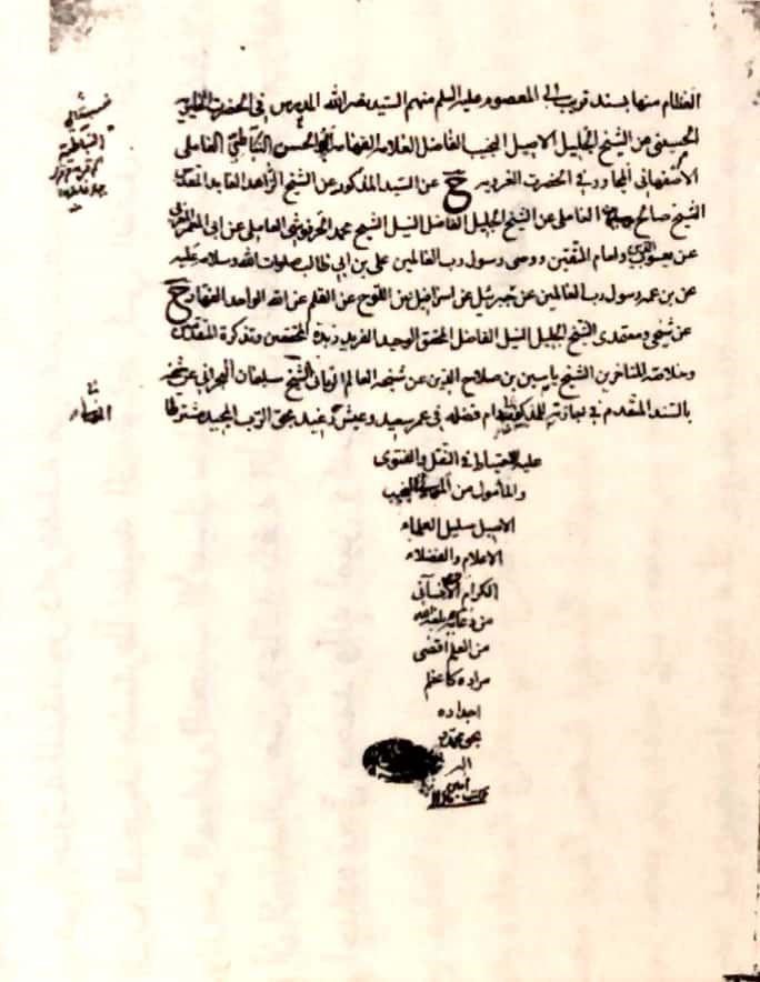 ح - عن شيخي ومعتمدي الشيخ الجليل النبيل الفاضل المحقق الوحيد الفريد وزبدة المحققين وتذكرة المتقدمين، وخلاصة المتأخرين الشيخ ياسين بن صلاح الدين، عن شيخه العالم الرباني الشيخ سليمان البحراني، عن شيخه بالسند المتقدم في إجازته للمذكور - دام فضله - عن عمر سعيد وعيش رغيد، بحق الرب المجيد مشترطاً عليه الاحتياط في النقل والفتوى، والمأمول من المولى النجيب الأصيل سليل العلماء الأعلام والفضلاء الكرام أن لا ينساني من دعائه - بلغه الله من العلم أقصى مرداه - كأعظم أجداده بحق محمد وآله آمين وكتب 1160 هـ ».