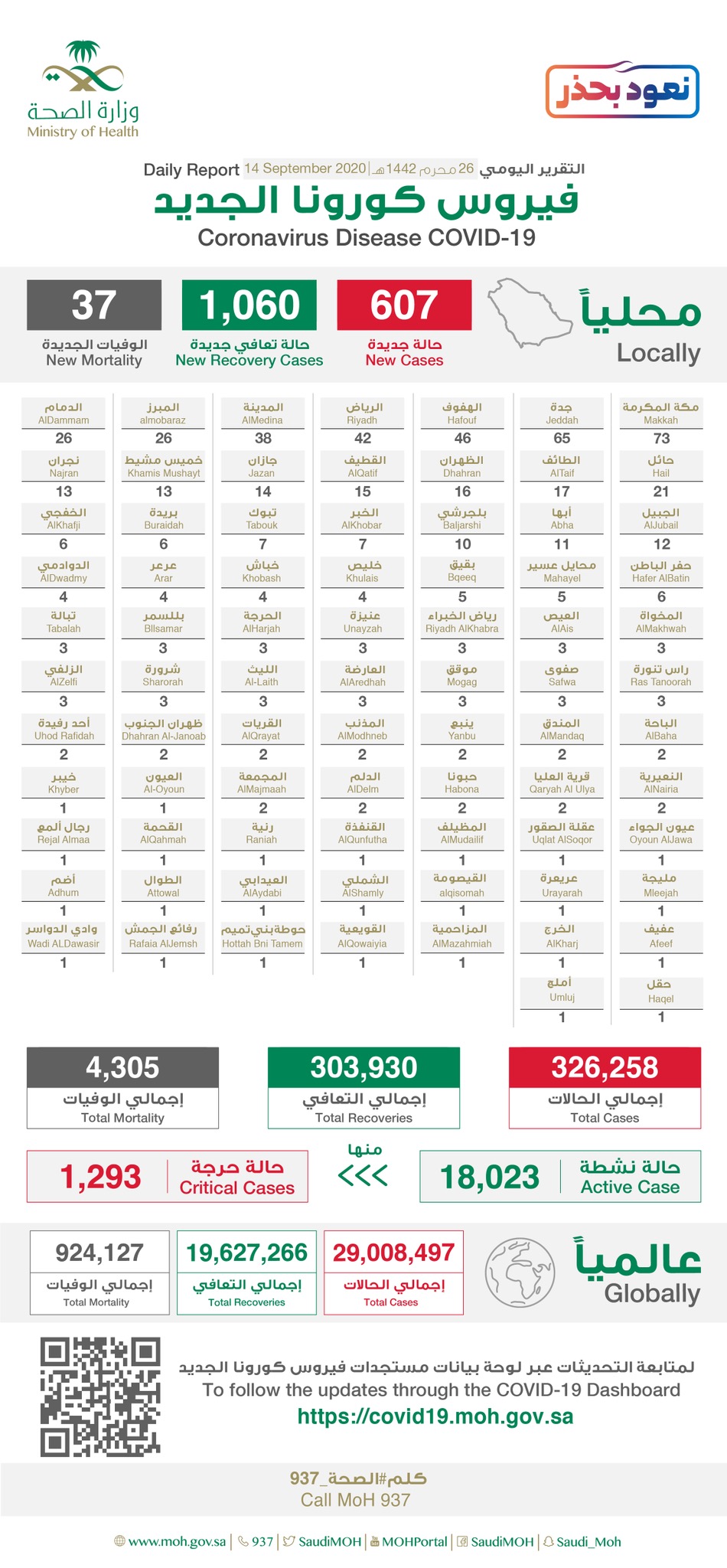 ولمعرفة تفاصيل إجمالي توزيع حالات الإصابة والتعافي، يمكن زيارة الموقع الإلكتروني المخصص من وزارة الصحة للاطلاع على مستجدات الفايروس في المملكة، والإحصاءات اليومية عبر الرابط https://covid19.moh.gov.sa/