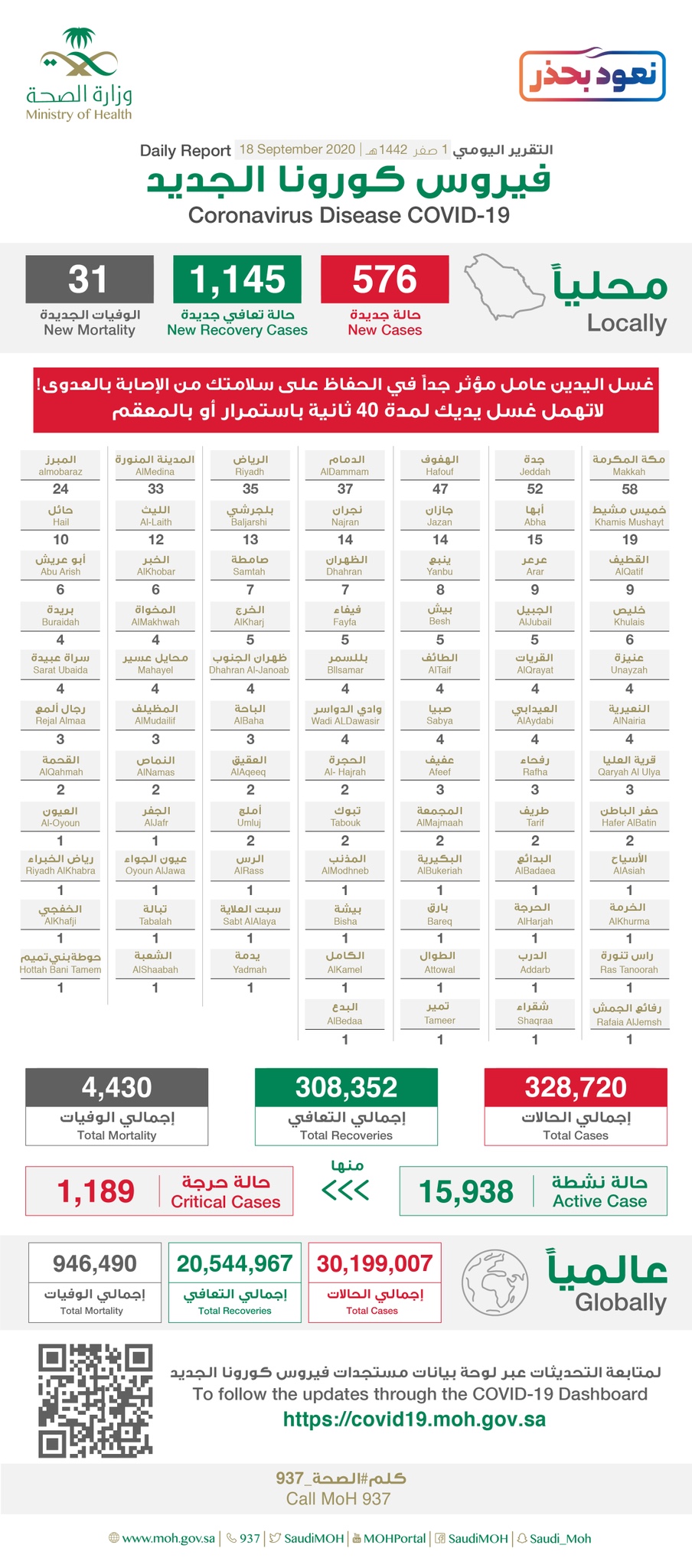 أعلنت وزارة الصحة اليوم ”الجمعة“ تسجيل 576 إصابة جديدة بفايروس كورونا المستجد المسبب لمرض ”كوفيد19“. منها 9 في القطيف. ليصبح عدد الحالات المؤكدة في المملكة «328.720» حالة.
