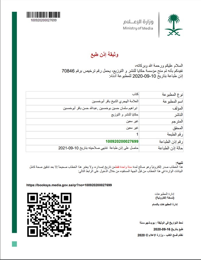 ولقد حصلنا على الترخيص والأذن اللازمين من وزارة الإعلام لطبعه ونشره ”صورة رقم 2“، وكم كانت فرحتي عندما جاء الترخيص والإذن لأني أعتبر هذا العمل من أهم وأكبر الأعمال التي قمت بها كما لا أنسى جهود اللجنة بالوقوف معنا فلهم منا خالص الشكر والثناء.