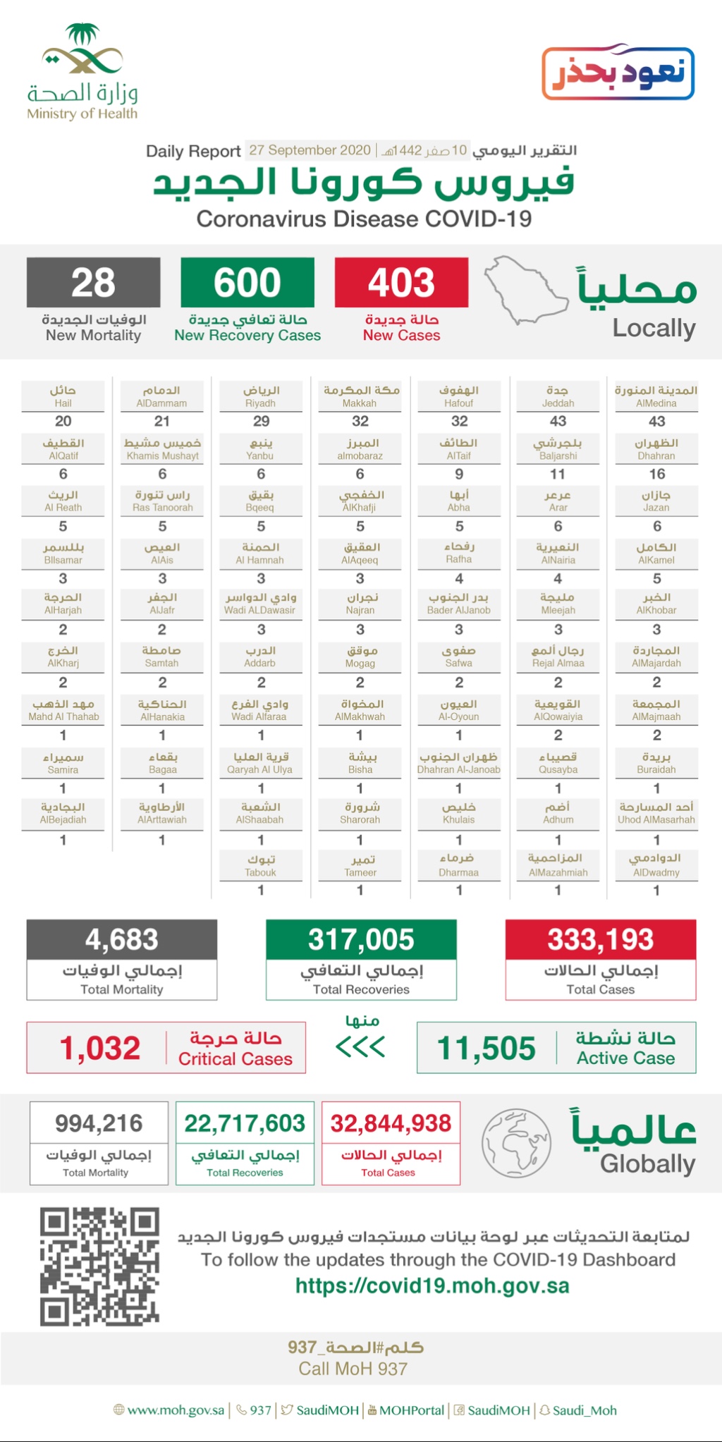 وتم تسجيل 600 حالة تعافٍ جديدة منها 6 في القطيف، لترتفع الحالات الإجمالية للتعافي إلى 317005 حالة.