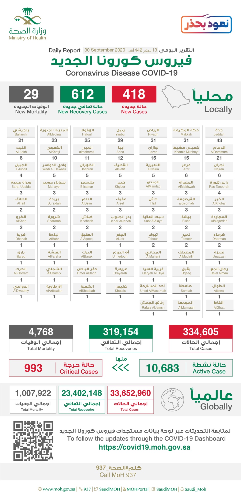 الصحة: تسجيل 418 إصابة جديدة بكورونا.. منها ”5“ في القطيف و”صفر“ بصفوى