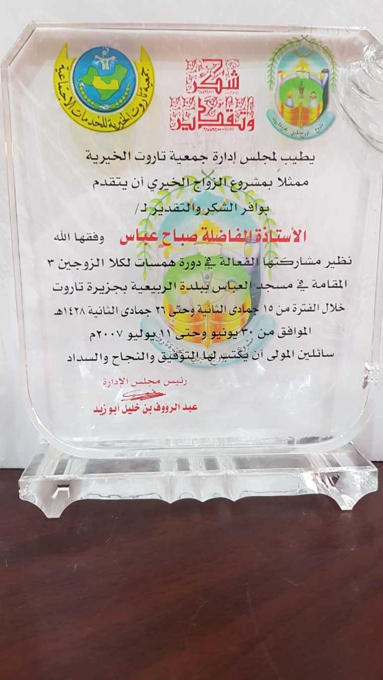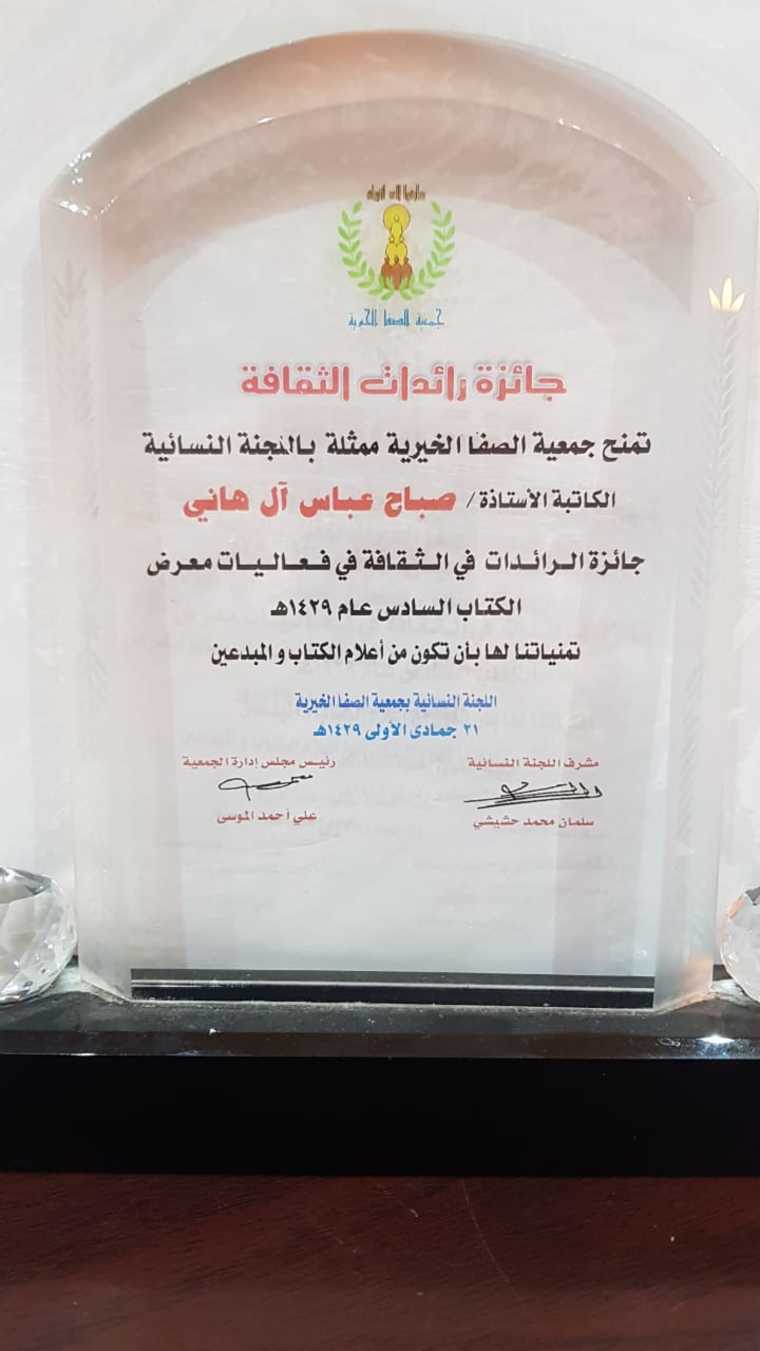 31 - حاصلة على جائزة رائدات الثقافة في فعاليات معرض الكتاب السادس عام 1429 هجرية الذي تشرف عليه اللجنة النسائية - في جمعية الصفا الخيرية بصفوى