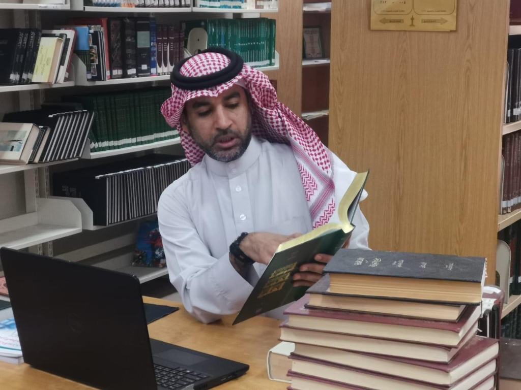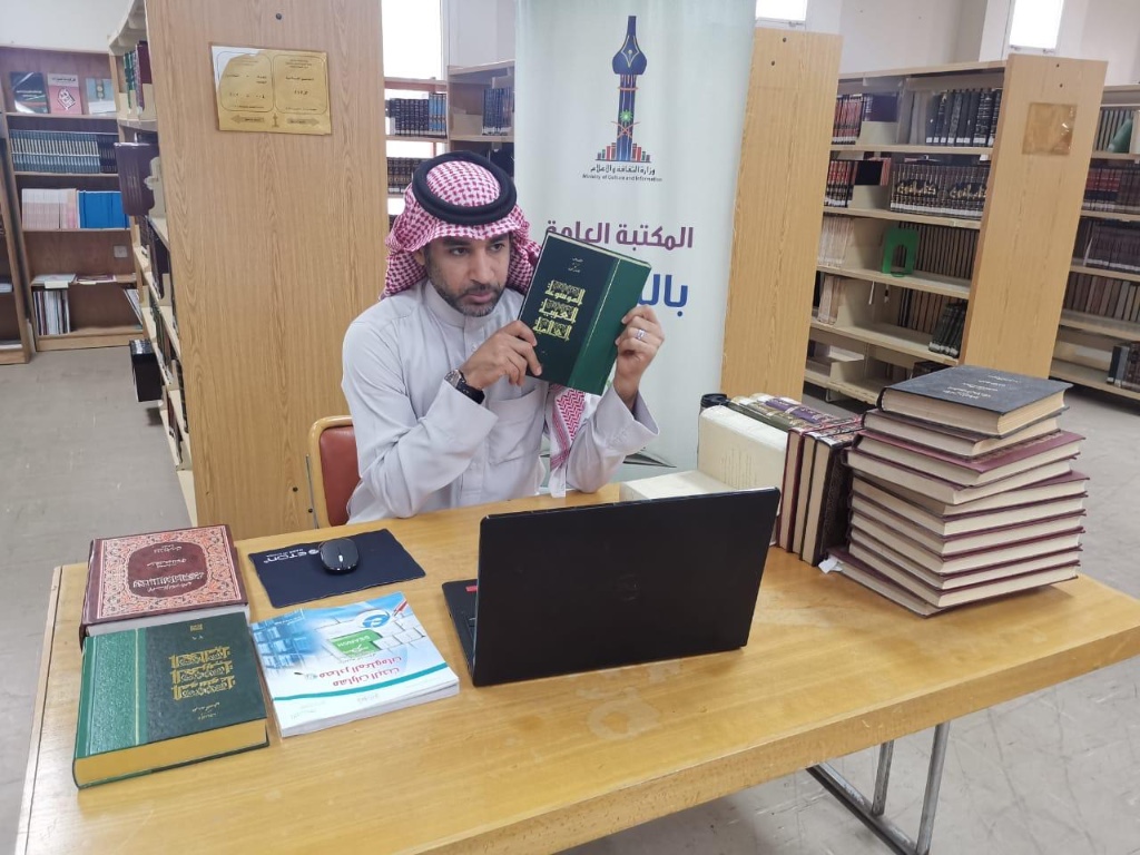 نقل مُعلم مهارات البحث ومصادر المعلومات بإحدى المدارس الثانوية ”منير جعفر الشرفا“، طلابه، إلى أنحاء المكتبة العامة عبر تطبيق ”تيمز“، أثناء درسه الافتراضي لهم.