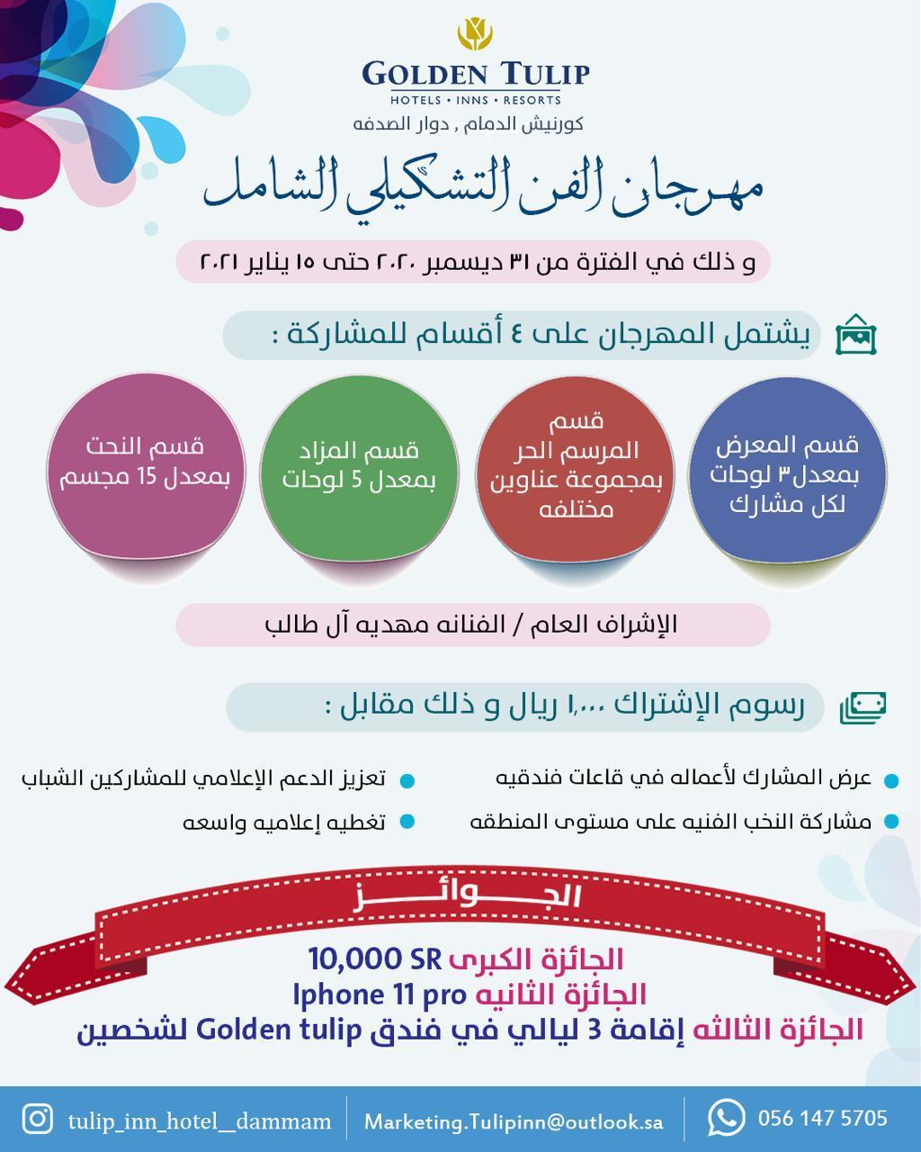 ينطلق مهرجان الفن التشكيلي الشامل في فندق قولدن توليب بمدينة الدمام وذلك في الفترة من