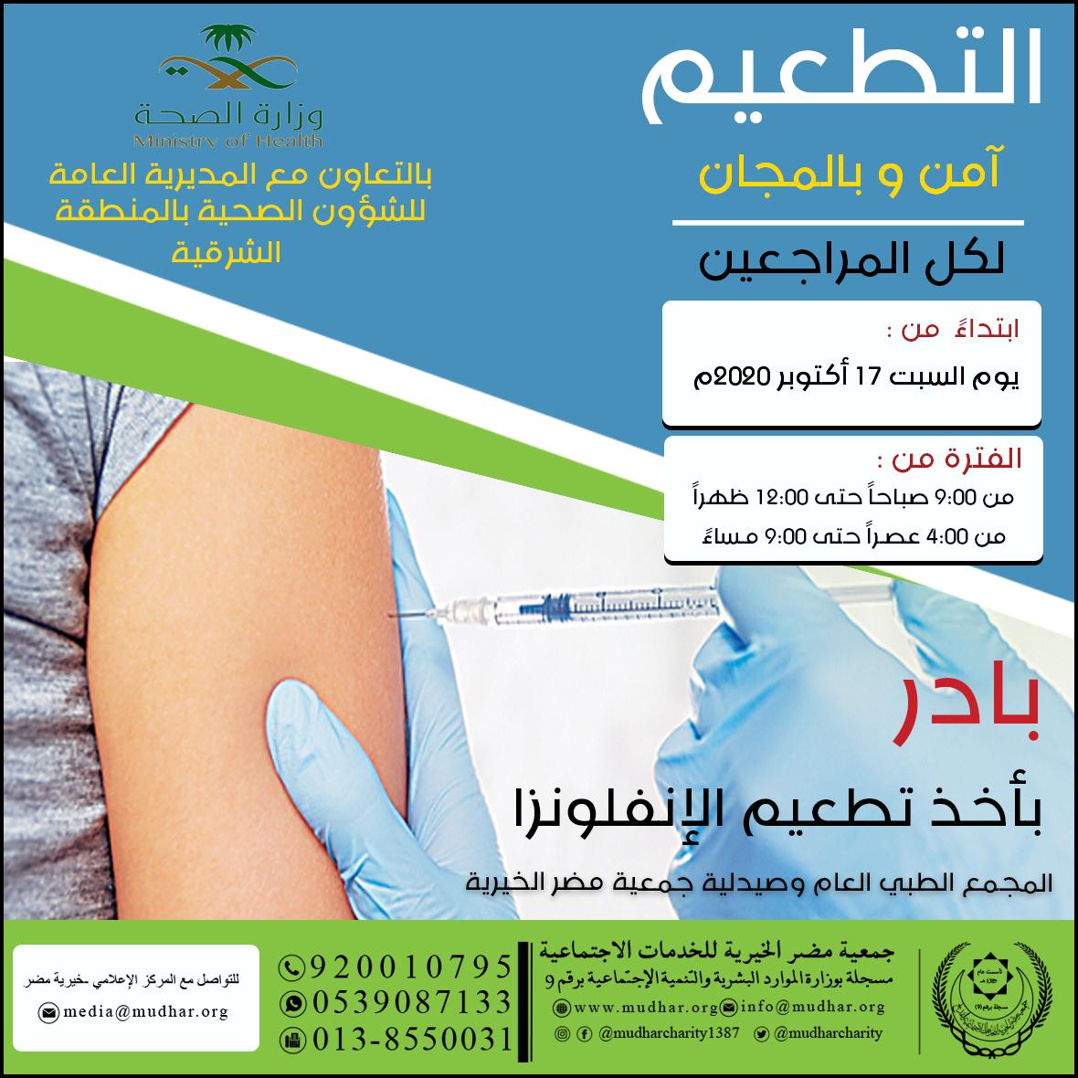 انطلقت في مجمع جمعية مضر الطبي العام اليوم السبت حملة التطعيم ضد الانفلونزا الموسمية، بالتعاون مع المديرية العامة للشؤون الصحية بالمنطقة الشرقية.