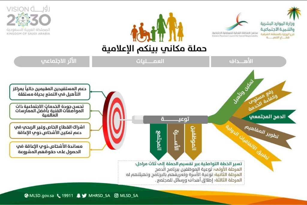 وتستهدف الحملة التي أطلقتها وكالة التأهيل والتوجيه الاجتماعي بالوزارة، تمكين الأشخاص ذوي الإعاقة وأسرهم الملحقين في مراكز التأهيل الشامل والدمج الاجتماعي لهم، ورفع مستوى الدعم وكفاءة وجودة الخدمات الاجتماعية المقدمة.