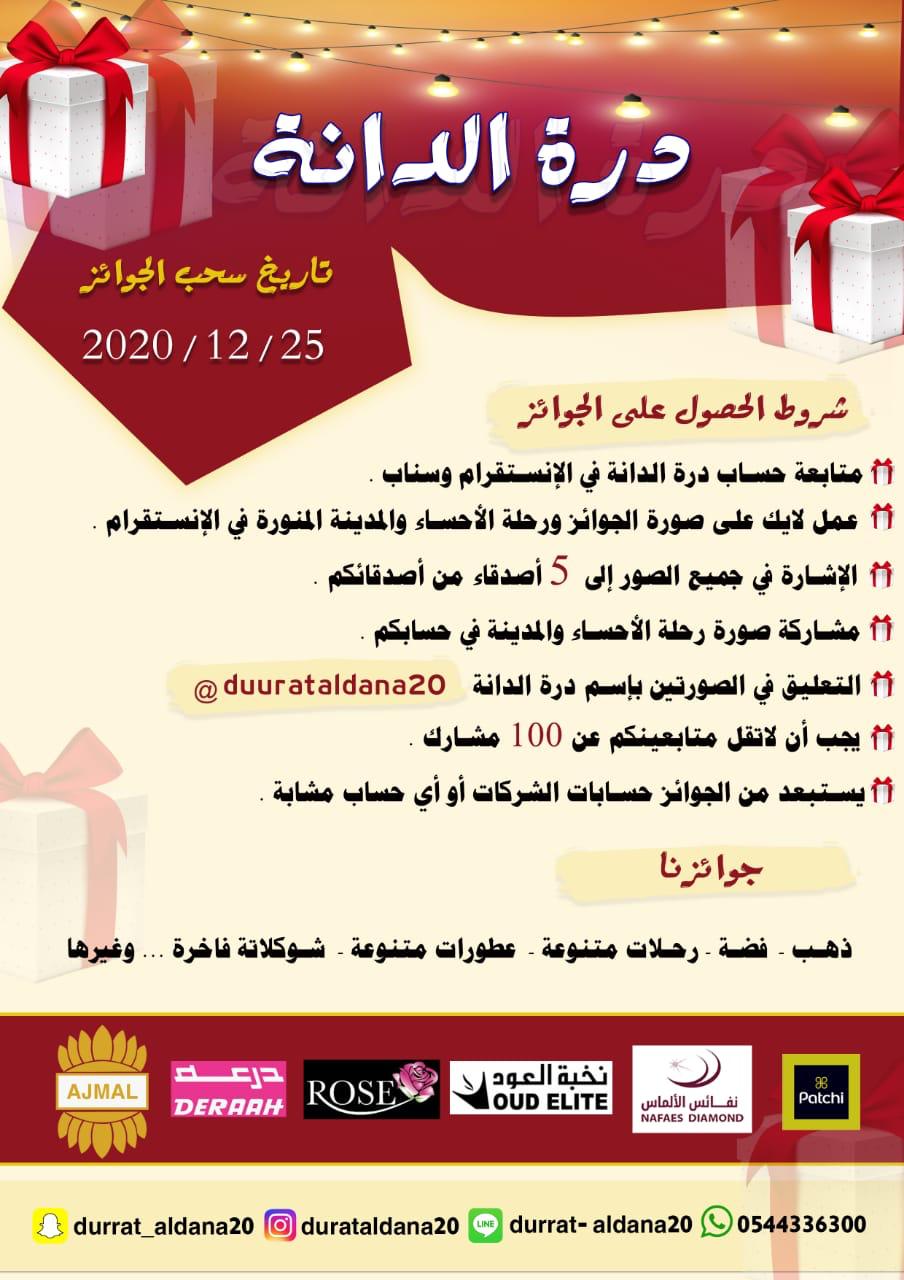 تعلن "درة الدانة للخدمات العامة والسياحة" عن توزيع 3 جوائز كل أسبوعين ولمدة شهرين حسب الشروط الموضحة في صورة الجوائز