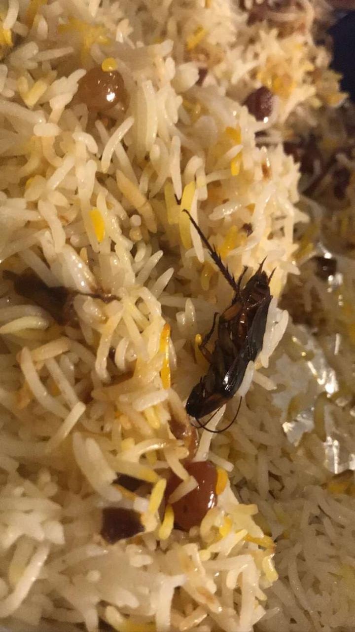 وتلقت البلدية بلاغ من مواطنة وثقت بالفيديو وجود حشرة «صرصور» في طبق الرز، والذي اختلط مع حشوة البصل والزبيب.