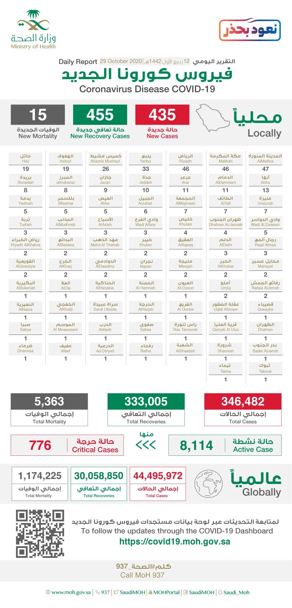 وتم تسجيل 455 حالة تعافٍ جديدة، لترتفع الحالات الإجمالية للتعافي إلى 333005 حالة، (96 % من إجمالي الإصابات المسجلة).