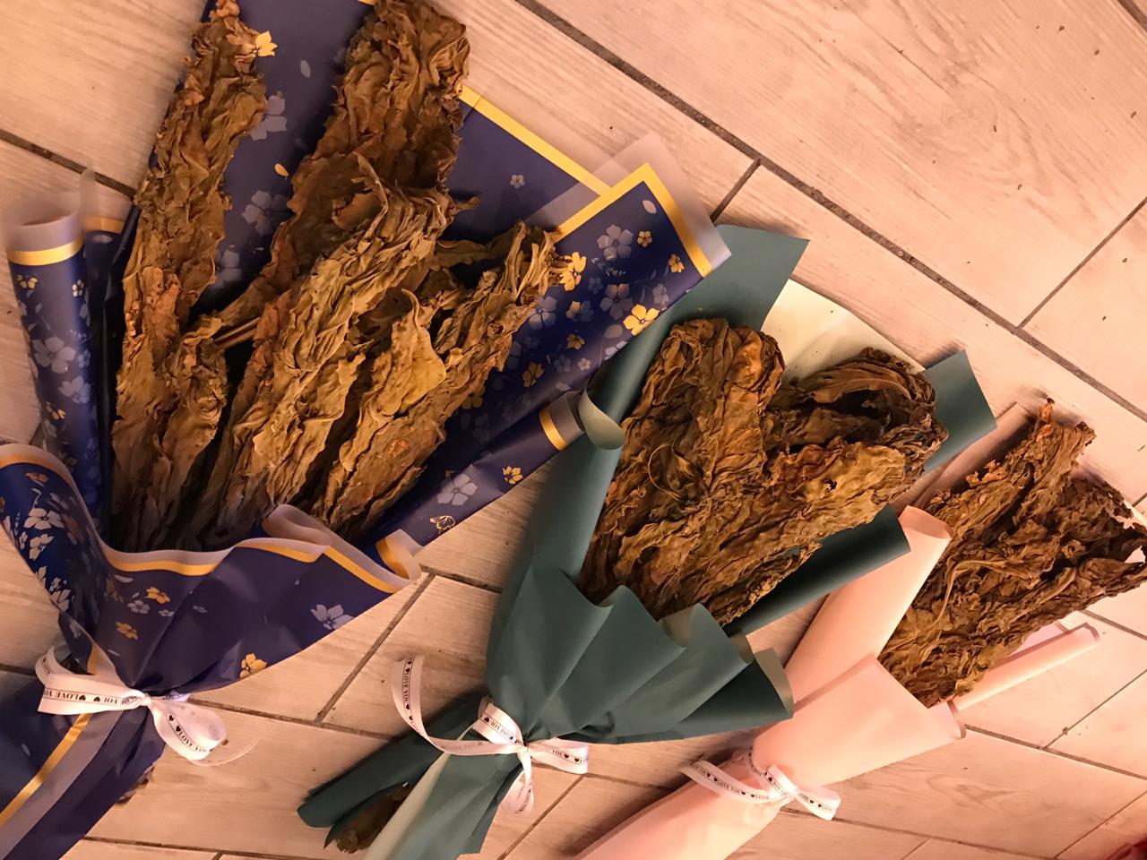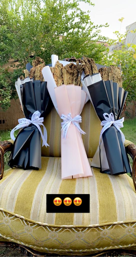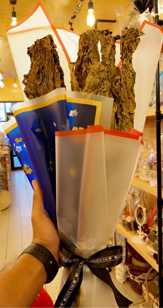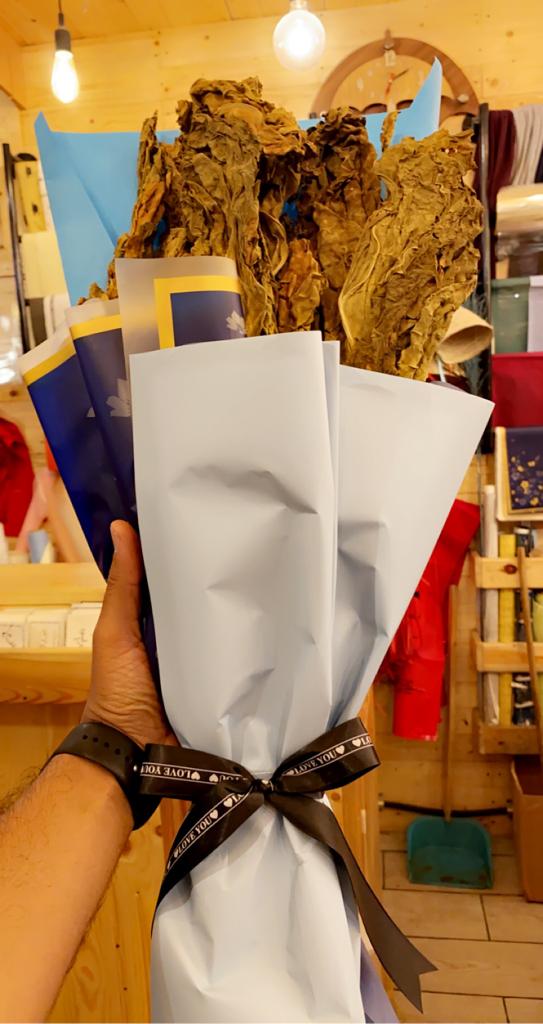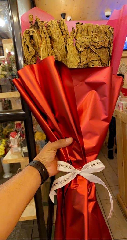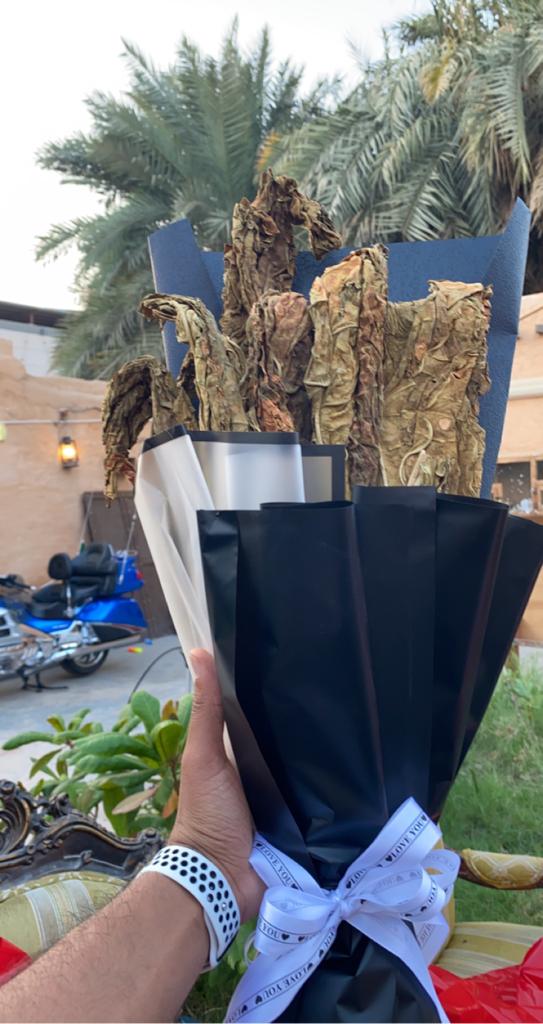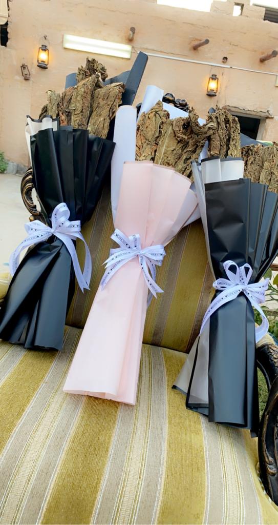 عوضا عن الزهور الطبيعية أهدى بائع تبغ من مدينة سنابس بمحافظة القطيف زملاءه ومعارفه باقات من التبغ الخام ”التتن“ غالي الثمن والشحيح في السوق المحلي.