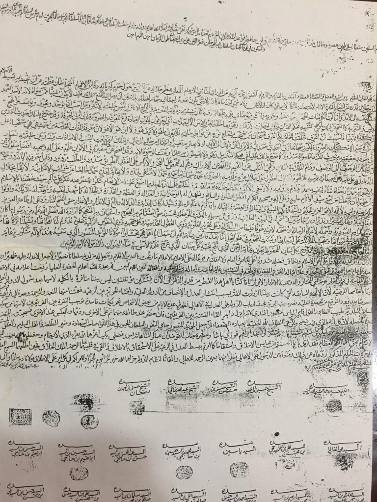 أما بعد: فإن من عناية الله أن جعلنا يا أهل هجر تحت لواء مولانا المؤيد المنصور الذي سعيه عند الإله مشكور برعاية العالم …… بذلك الممدوح بكل لسان المحفوظ بعين عناية الرحمن الذي ثلج بحبه كل جنان الذي عرج علمه الأسنى في سماء العنوان ذاك مولانا أمير المؤمنين.