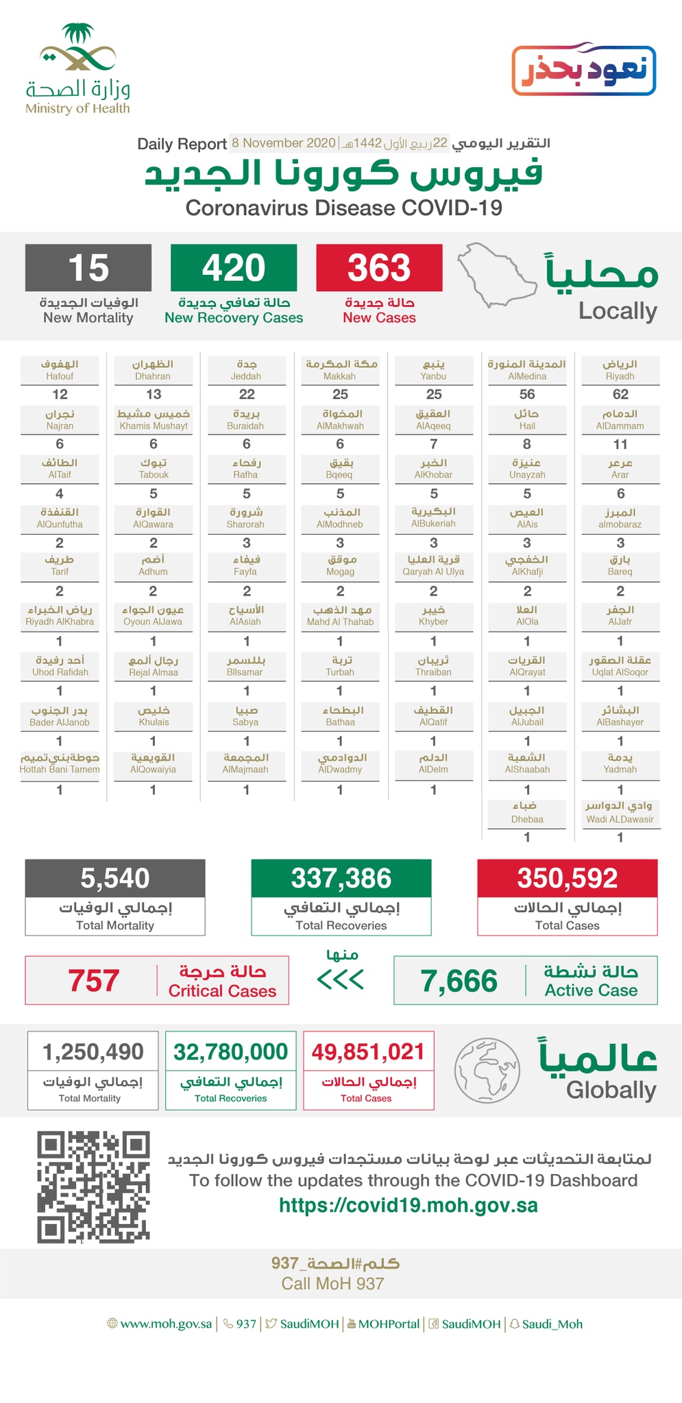 الصحة: تسجيل 363 إصابة جديدة بكورونا.. منها 1 في القطيف