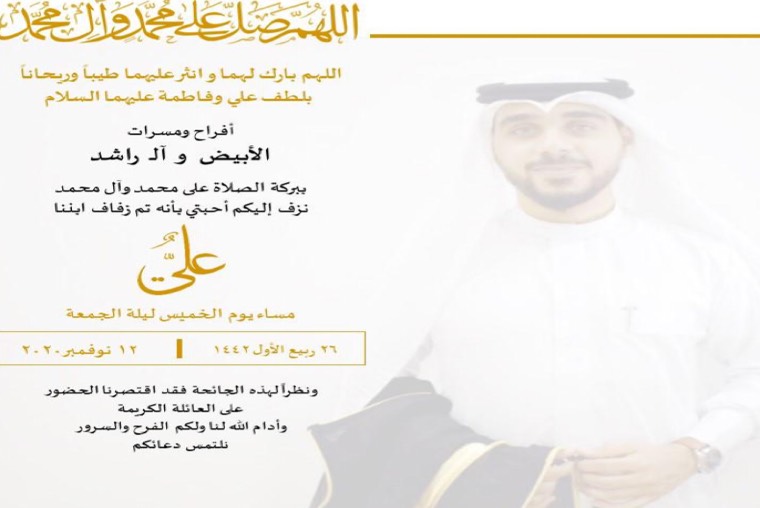 وعبر العريس عن سعادته الغامرة بدخوله القفص الذهبي، ملتمسا العذر عن عدم اقامة حفل زفاف نتيجة ظروف الجائحة القائمة، سائلا الله أن يوفقه وعروسه ويرزقهما الذرية الصالحة.