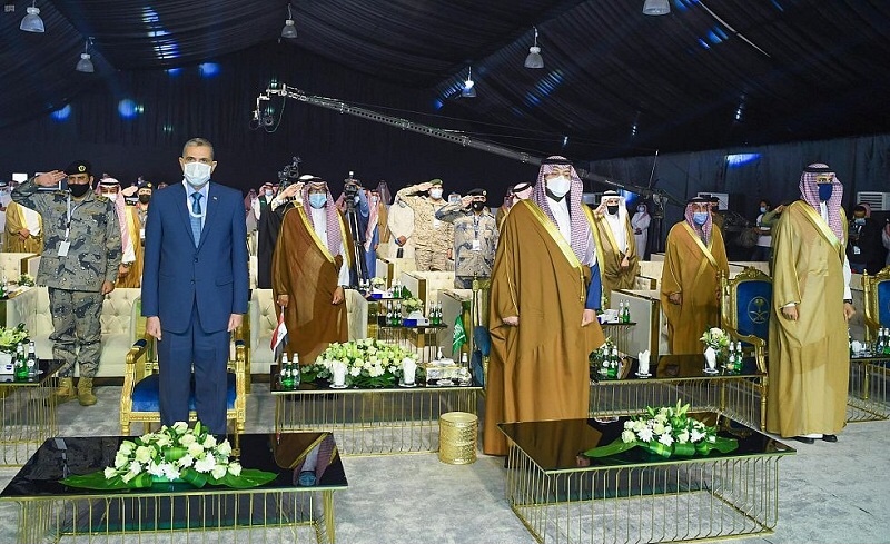وفور وصوله لمقر الحفل أزاح الستار عن اللوحة التذكارية لافتتاح منفذ جديدة عرعر، واطلع على مجسم المنفذ، ثم عُزف السلامان الملكي السعودي، والوطني العراقي.