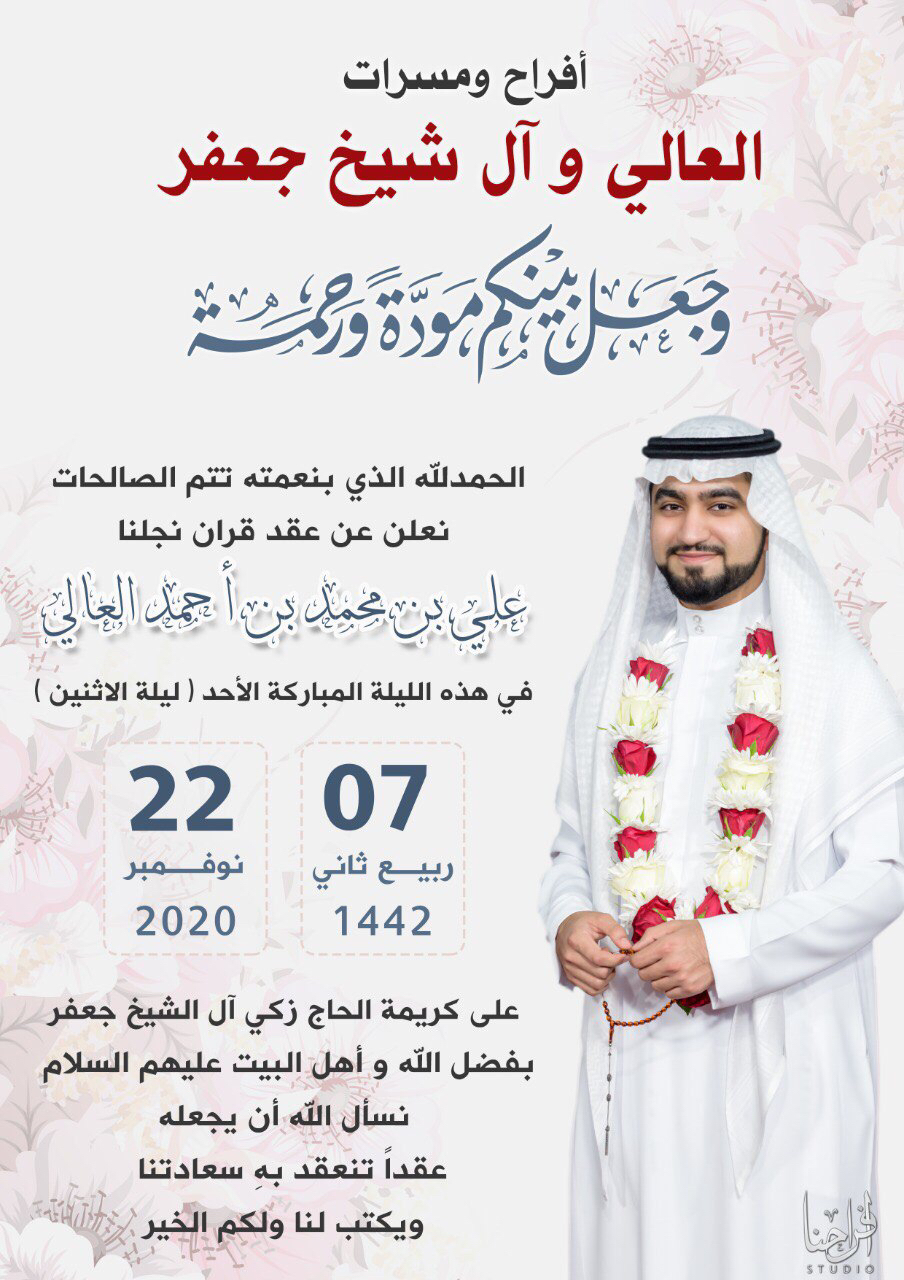 احتفلت عائلة العالي وآل الشيخ جعفر مساء يوم الأحد في صفوى بعقد قران الشاب علي محمد أحمد العالي على كريمة الحاج زكي آل الشيخ جعفر. وسط فرحة الأهل والأصدقاء ومحبي العريسين.
