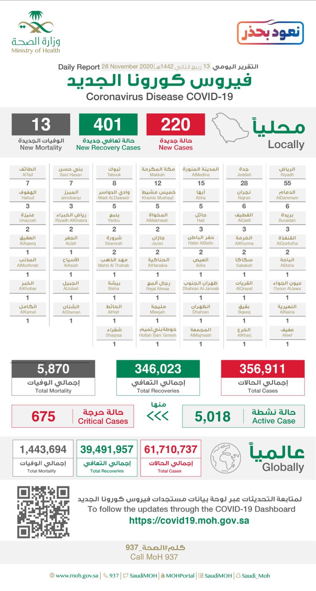 ولمعرفة تفاصيل إجمالي توزيع حالات الإصابة والتعافي، يمكن زيارة الموقع الإلكتروني المخصص من وزارة الصحة للاطلاع على مستجدات الفايروس في المملكة، والإحصاءات اليومية عبر الرابط https://covid19.moh.gov.sa
