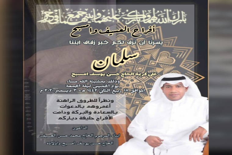 تحتفل عائلة العسيف وامسبح في التوبي مساء يوم الخميس بزفاف الشاب سلمان العسيف على كريمة الحاج حسن يوسف امسبح. وسط فرحة الأهل والأصدقاء ومحبي العريسين.