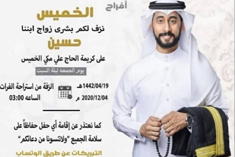 تحتفل عائلة الخميس في القطيف مساء يوم الجمعة بزفاف الشاب حسين الخميس على كريمة الحاج علي مكي الخميس وسط فرحة الأهل والأصدقاء ومحبي العريسين.