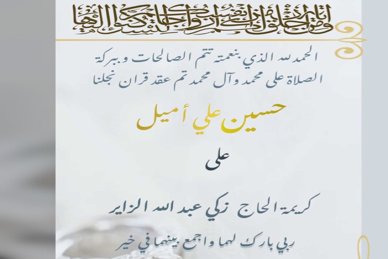 احتفلت عائلة أُميل والزاير في سنابس مساء يوم الجمعة بعقد قران الشاب حسين علي أُميل على كريمة الحاج زكي عبدالله الزاير وسط فرحة الأهل والأصدقاء ومحبي العريسين.
